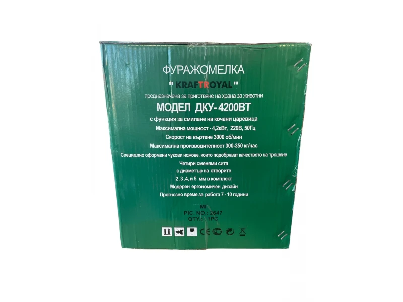 Moara de furaje KraftRoyal are o putere de 4200 W și o tensiune de alimentare de 220 V. Se utilizează pentru măcinarea cerealelor, grâului, porumbului etc. Productivitatea totală a mașinii este de 300 kg/h. Are o construcție stabilă cu rezistență la sarcină. Se livrează cu 4 site - 2, 3, 4, 5 mm.
