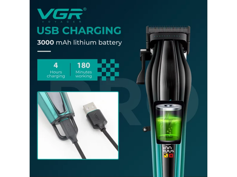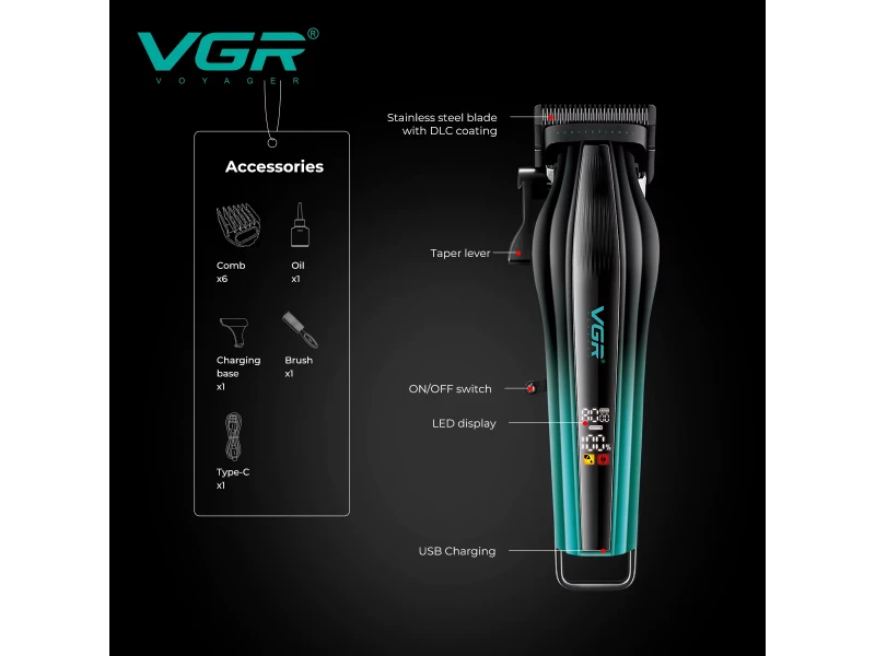 Cumpără o mașină de tuns profesională VGR V-273 cu lame DLC, 8000 rpm, afișaj LED și autonomie a bateriei de până la 180 de minute. Ideală pentru bărbați, frizeri și îngrijire la domiciliu.