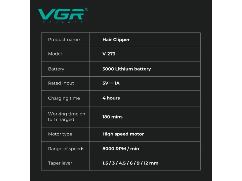VGR V-273 este conceput pentru bărbații care nu fac compromisuri în ceea ce privește calitatea. Combină o construcție robustă , tehnologie modernă și performanță ridicată . Potrivit pentru coafori profesioniști, frizeri și pentru uz casnic - este mai mult decât o simplă tunsoare.