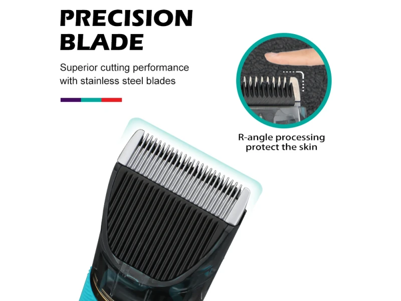 Mașina de tuns are o lamă de oțel pentru a asigura un bărbierit sau un tuns rapid și eficient. În mijlocul părții frontale a suportului mașinii de tuns se află un afișaj LCD care arată capacitatea bateriei.