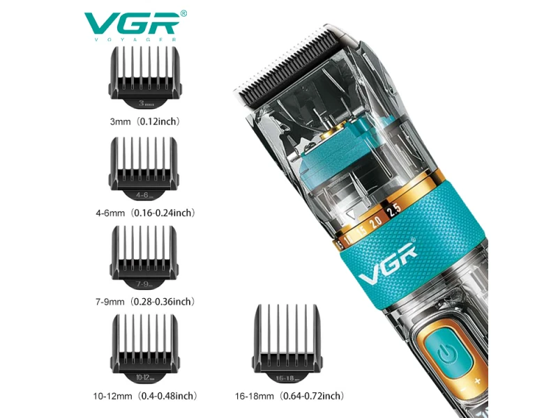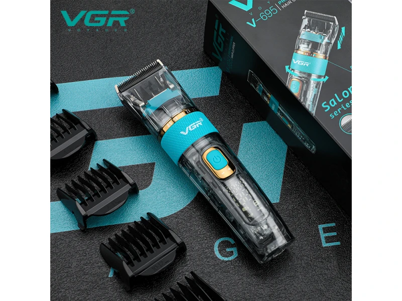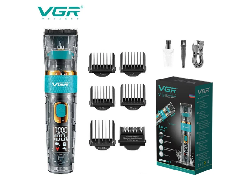 Mașină de tuns VGR 650, lamă de oțel, afișaj LCD, șase accesorii, auriu