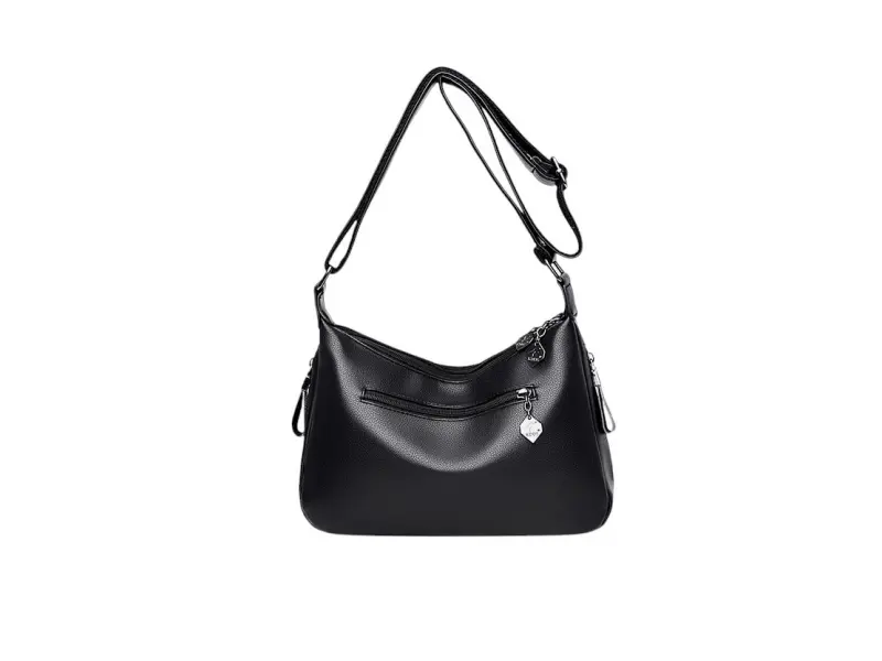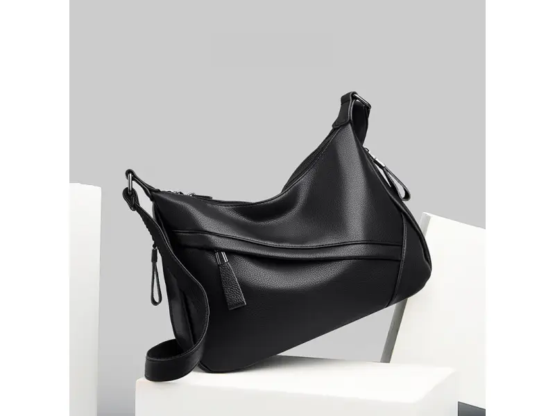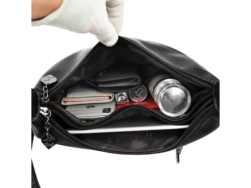 Geantă medie din piele ecologică de calitate. Geantă neagră cu multe compartimente și mâner lung reglabil. Geantă de zi cu zi cu un design interesant.