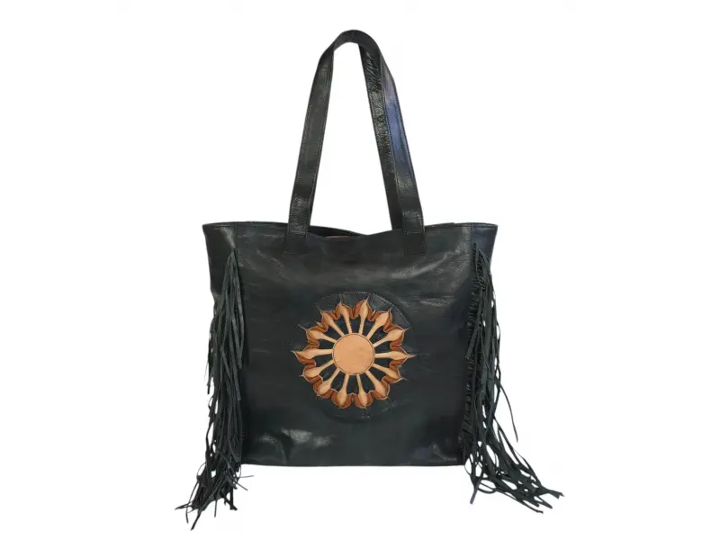 Geantă de mână unică din piele naturală, lucrată manual. Geantă de mână marocană cu un design unic, cu soare și franjuri. Geantă elegantă cu mânere confortabile. - ePazar.bg
