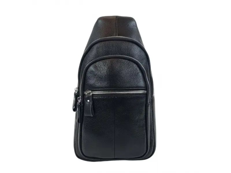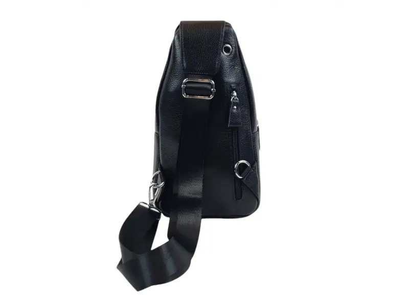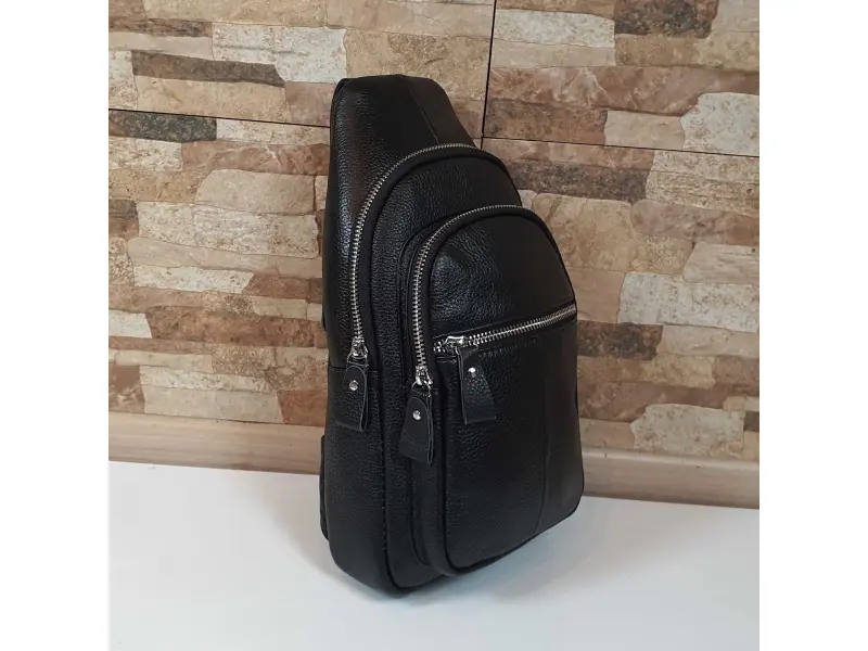 Geantă crossbody bărbătească din piele naturală. Geantă bărbătească neagră care poate fi purtată la piept, pe umăr sau la spate ca un rucsac. Geantă bărbătească cu un compartiment principal cu fermoar, un buzunar interior mic cu fermoar, un compartiment pentru telefon, două buzunare frontale și unul spate cu fermoar, o curea de umăr reglabilă confortabilă.