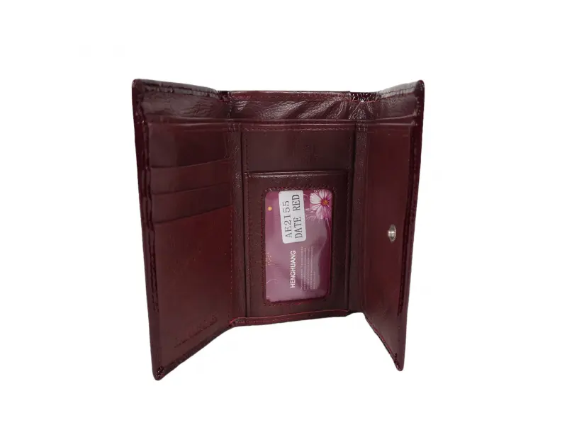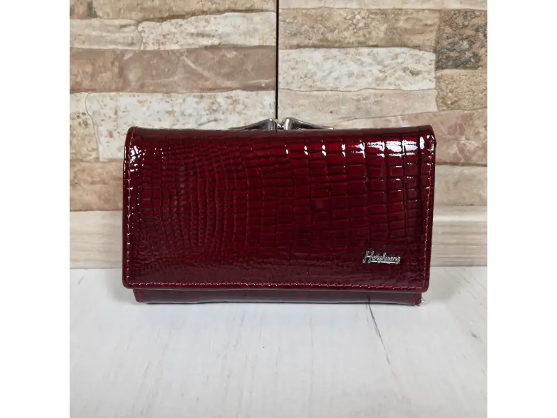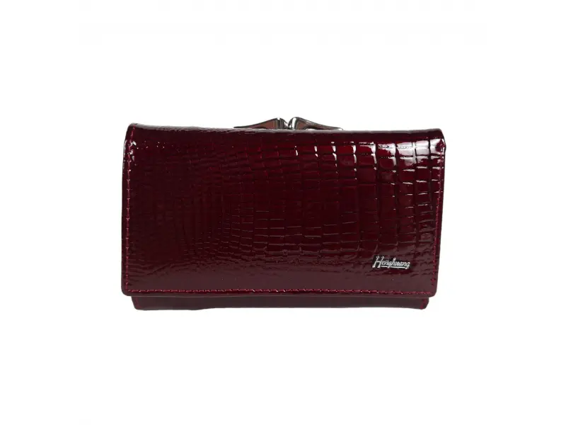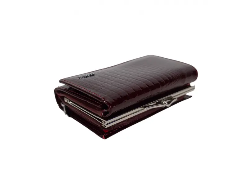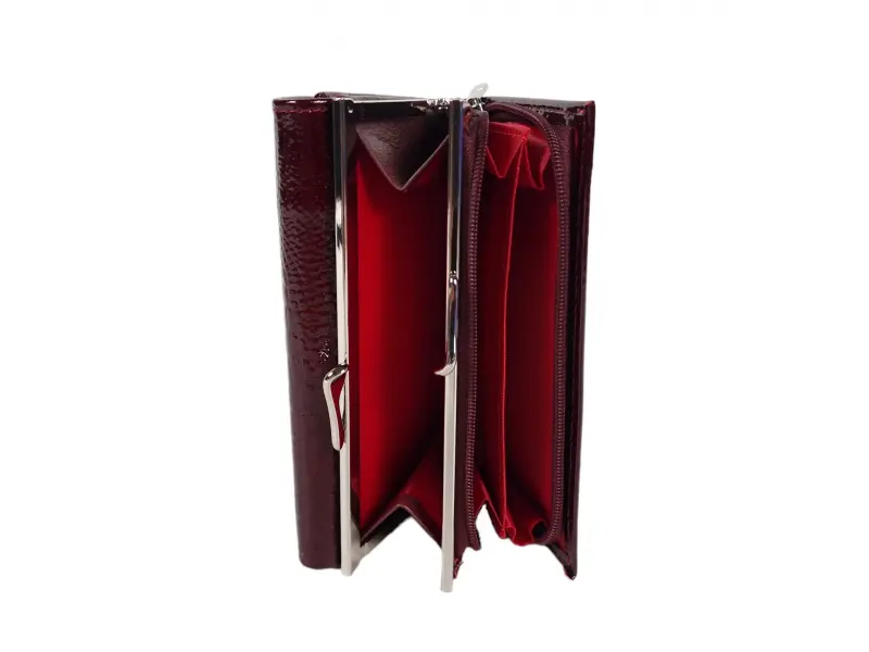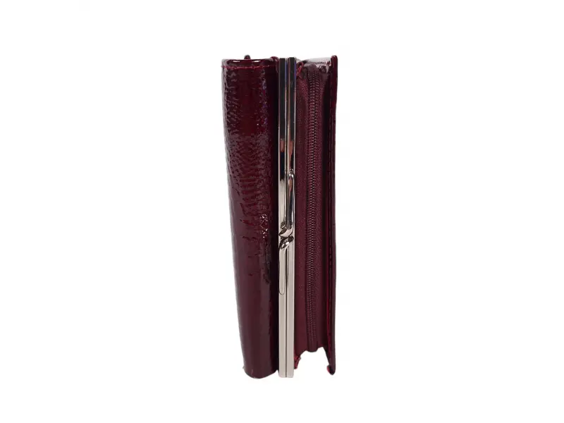 Portofel de damă de mărime medie, confecționat dintr-o combinație de piele lăcuită și piele naturală, de culoare vișinie. Portofel model nou cu compartimente pentru monede cu fermoar și clemă, spațiu pentru documente personale, sloturi pentru carduri, compartimentare convenabilă pentru bancnote.