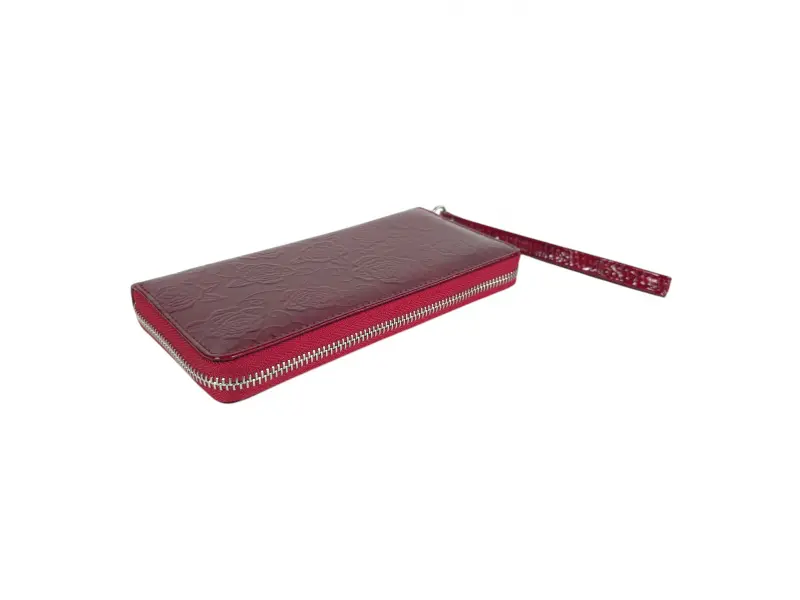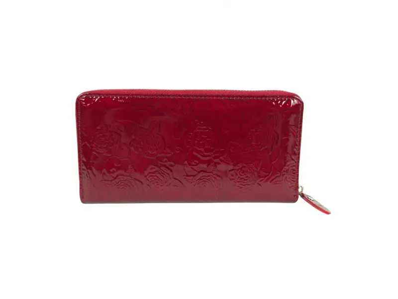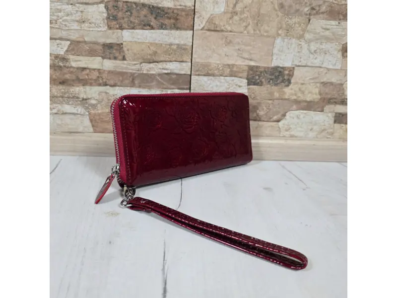 Poșetă lăcuită cu trandafiri - Poșetă de damă confecționată din piele naturală și piele lăcuită. - Închidere cu fermoar. - Compartimente pentru bancnote. - Compartiment pentru monede cu fermoar. - Compartimente pentru carduri și documente personale.