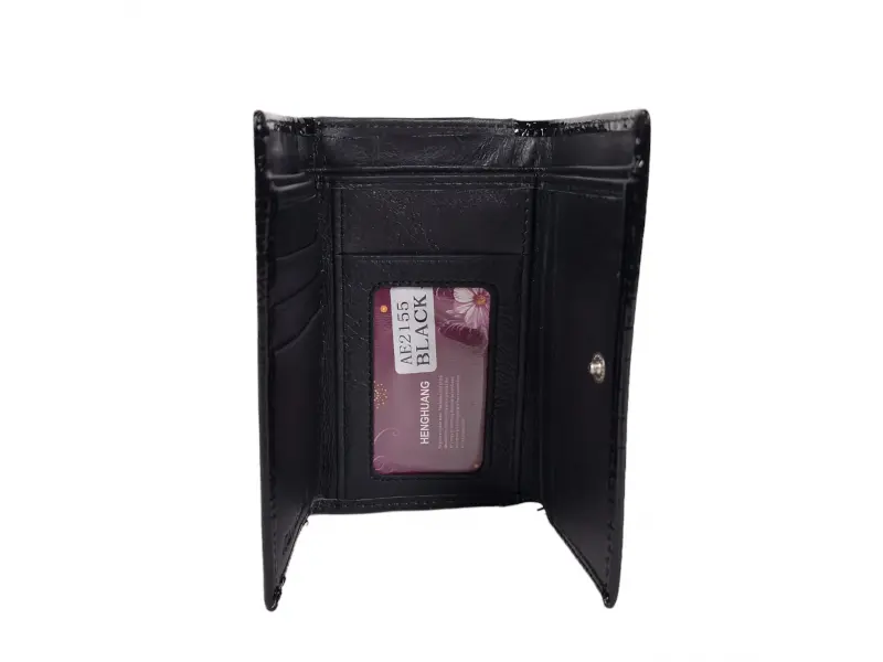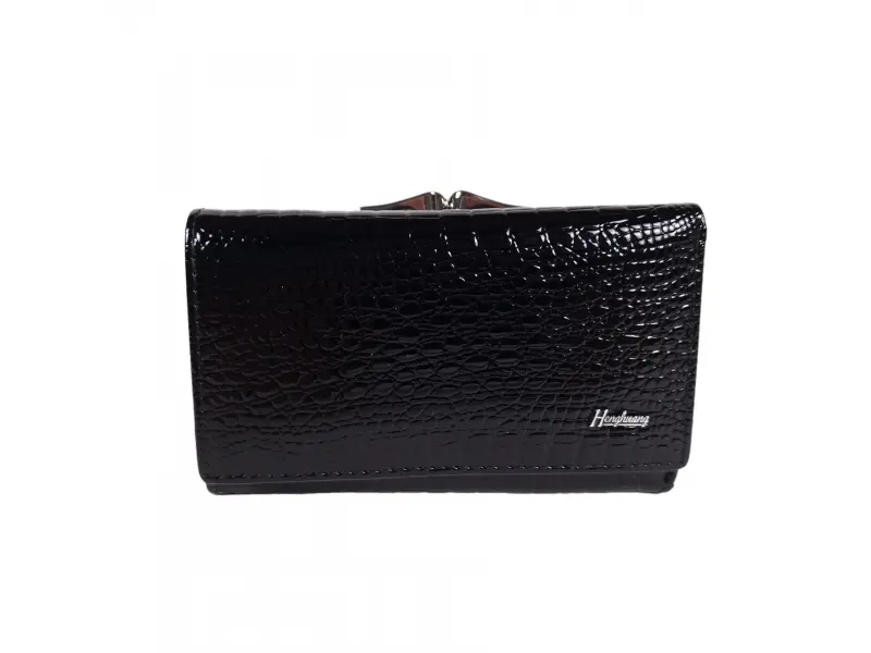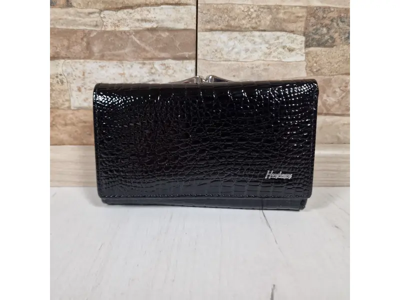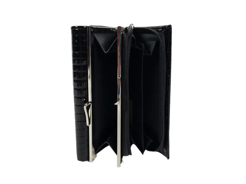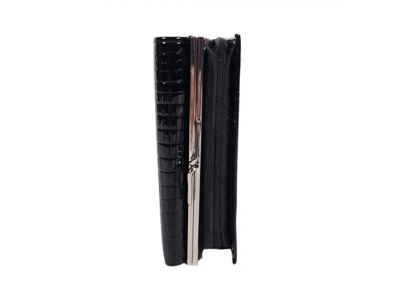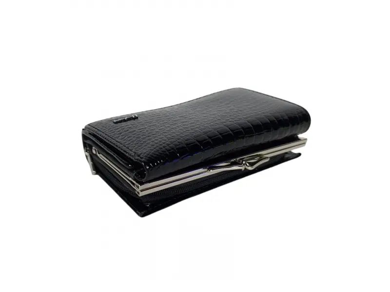 Portofel de damă de mărime medie, confecționat dintr-o combinație de piele lăcuită și piele naturală, de culoare neagră. Portofel model nou cu compartimente pentru monede cu fermoar și clemă, spațiu pentru documente personale, sloturi pentru carduri, compartimentare convenabilă pentru bancnote.