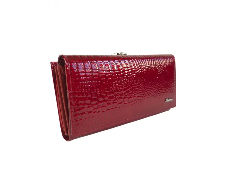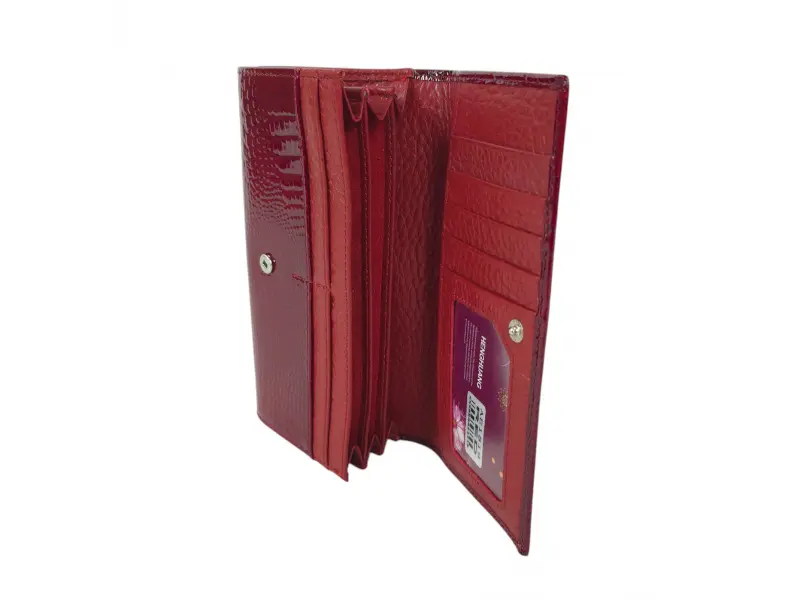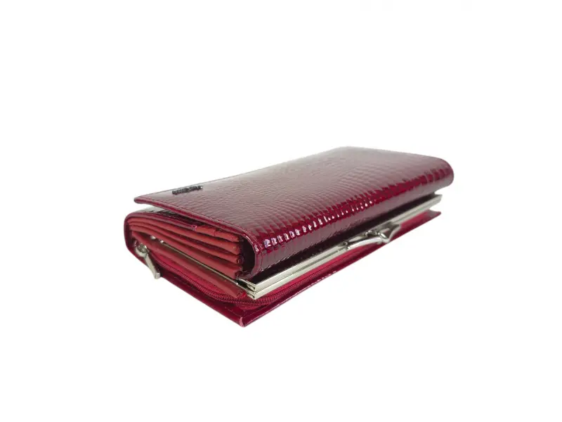 Portofel roșu de damă, confecționat din piele naturală și piele lăcuită. Portofel elegant de damă, cu compartimente pentru bancnote, sloturi pentru carduri și documente personale și un portofel pentru monede cu fermoar. Portofel frumos de damă, cu un design interesant.