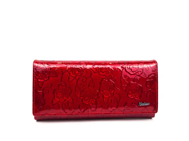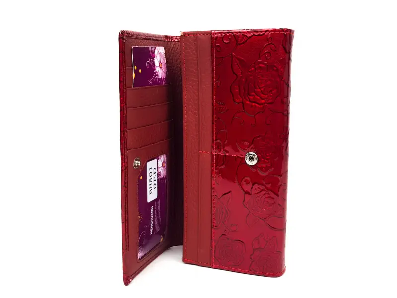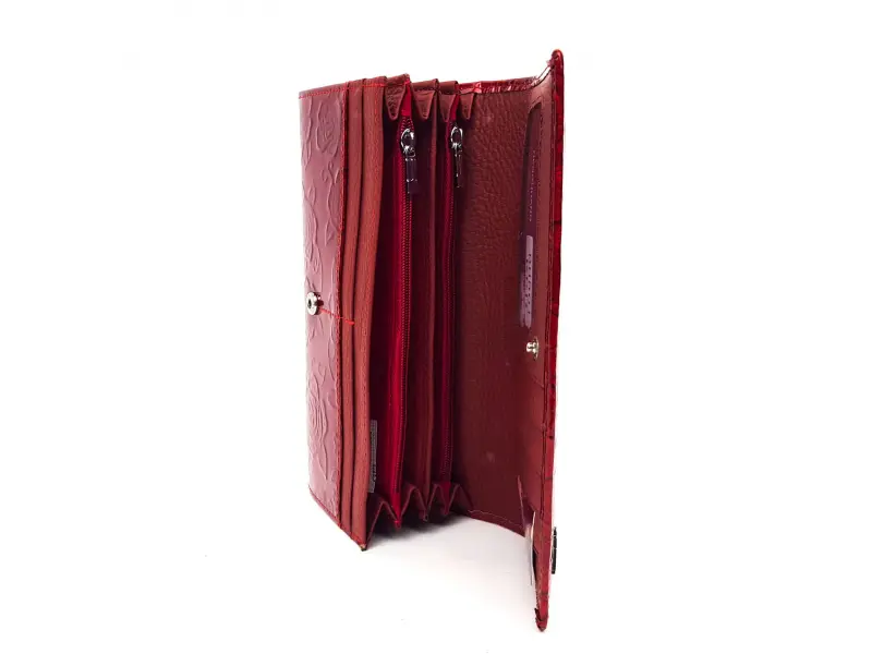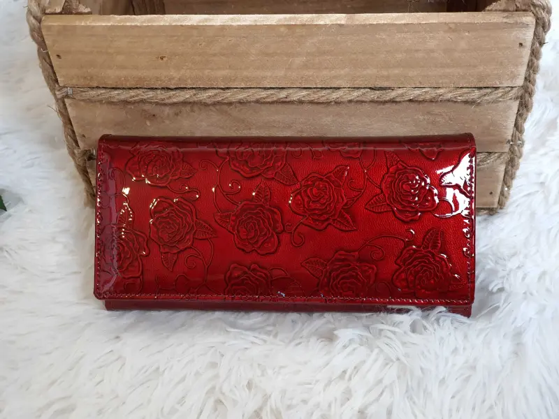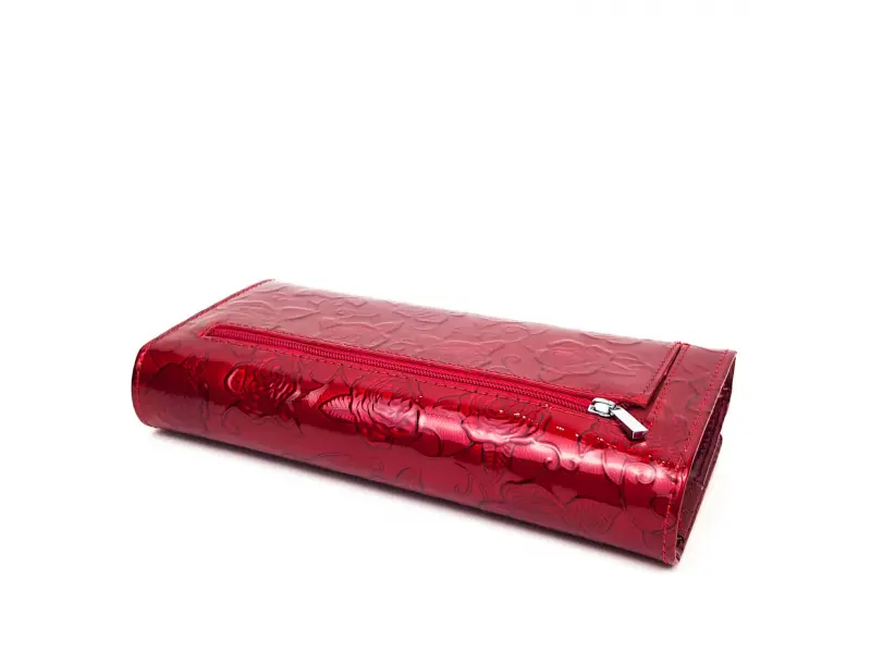 Portofel elegant de damă, confecționat din piele naturală, culoare roșie lăcuită. Portofel cu compartimentare convenabilă pentru bancnote, cu două compartimente care se închid cu fermoar, un compartiment cu fermoar pe spate. Sloturi pentru carduri și loc pentru documente personale. Un portofel în care veți distribui totul corect și convenabil. Portofel roșu de damă cu trandafiri gravați. Aranjamentul florilor poate fi diferit.