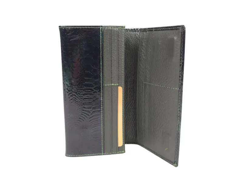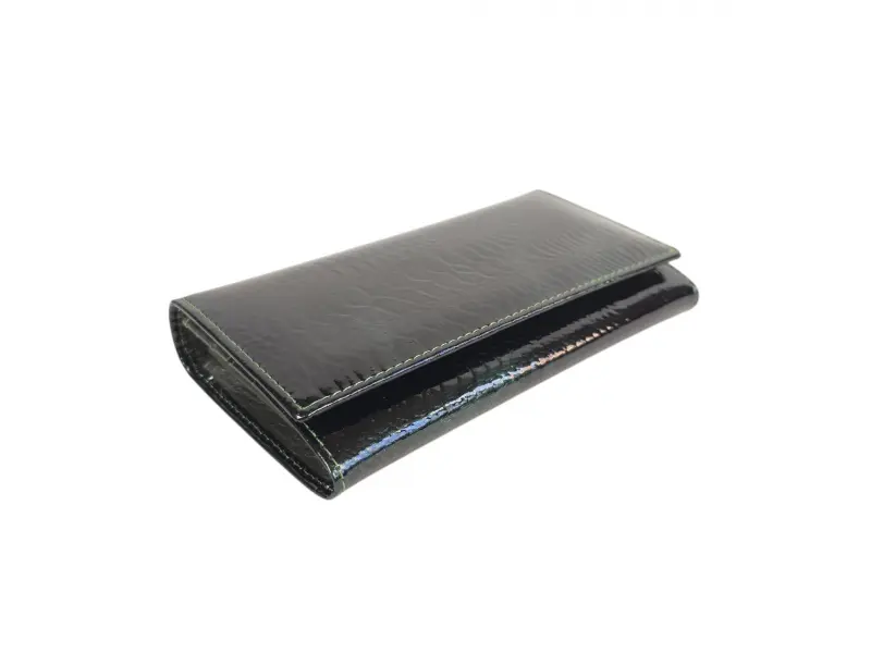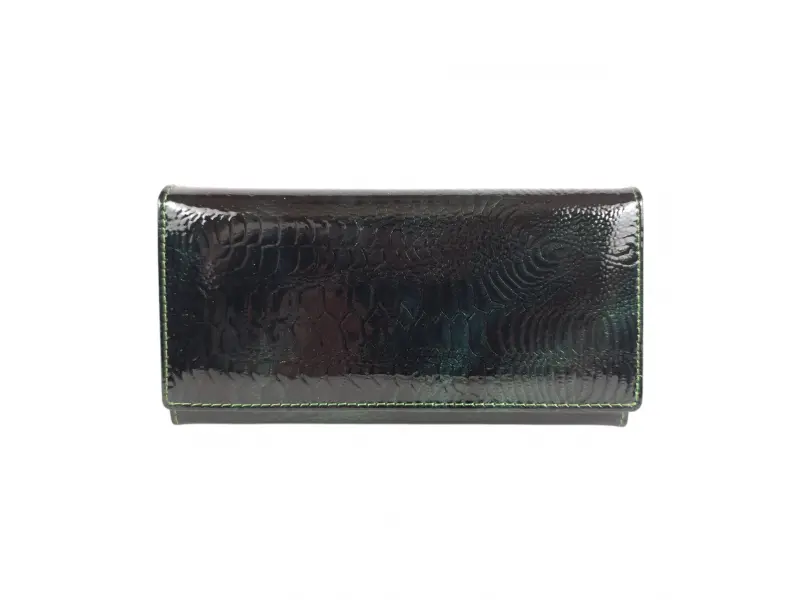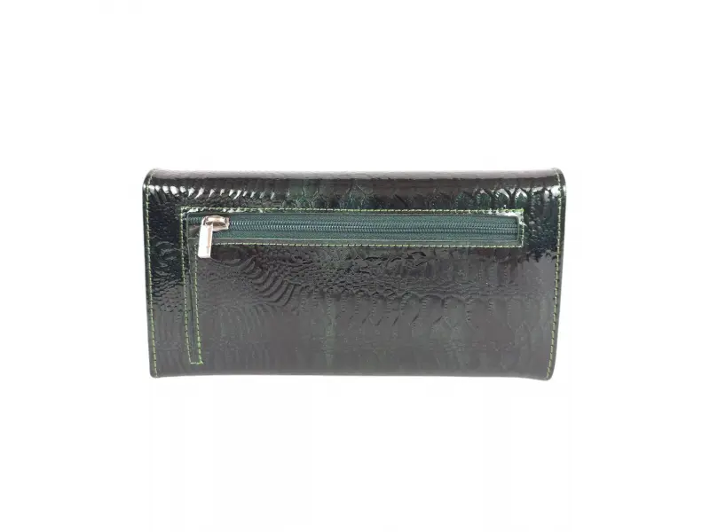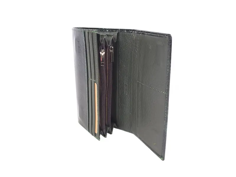 Portofel verde de damă, confecționat din piele naturală și piele lăcuită. Portofel mare de damă, cu compartimente pentru bancnote, sloturi pentru carduri și documente personale și un portofel pentru monede cu fermoar. Portofel elegant de damă, cu un design interesant.