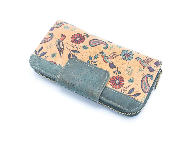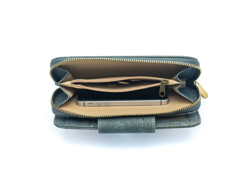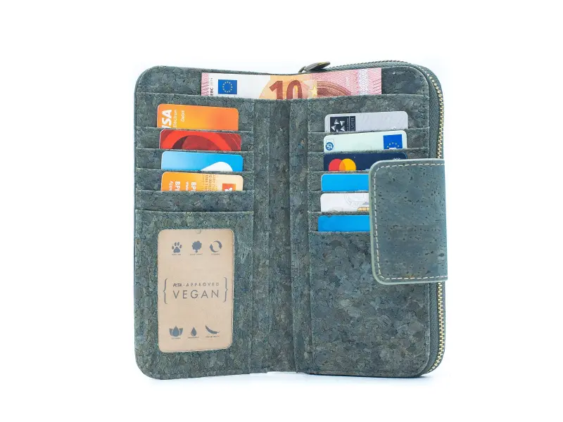 Portofel de damă de înaltă calitate, fabricat din material ecologic - plută. Portofel confortabil pentru femei, cu fermoar și buzunar exterior pentru monede cu fermoar, compartiment pentru monede și un buzunar mic pentru monede cu fermoar, numeroase sloturi pentru carduri și documente și un compartiment pentru bancnote.