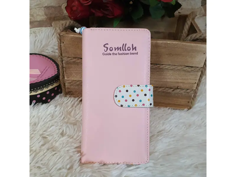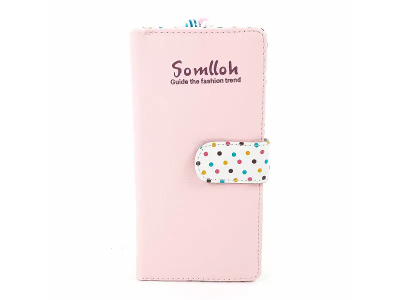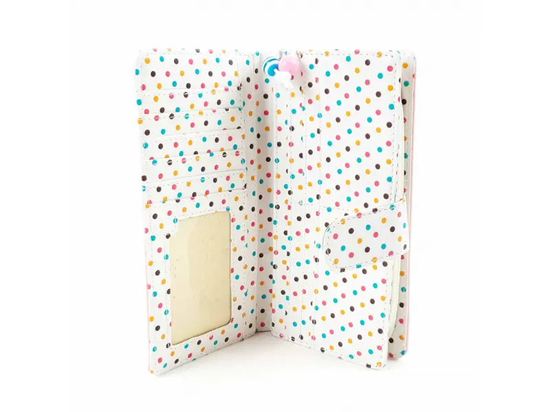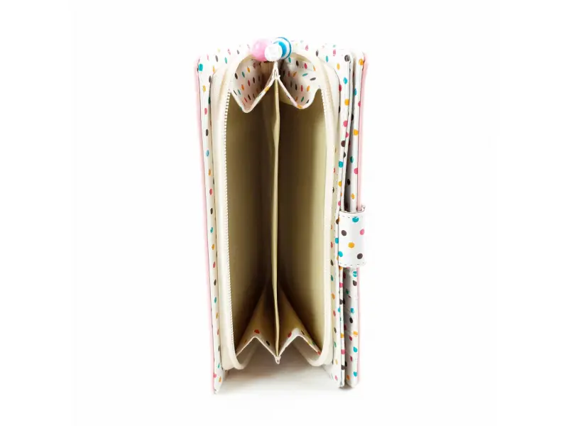 Portofel mare de damă, confecționat din piele ecologică roz. Model cu buline colorate, cu compartiment pentru bancnote, spațiu pentru carduri și acte de identitate și compartiment exterior cu despărțitor care se închide cu fermoar cu mărgele.