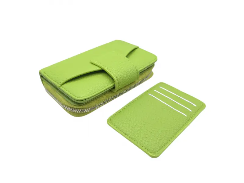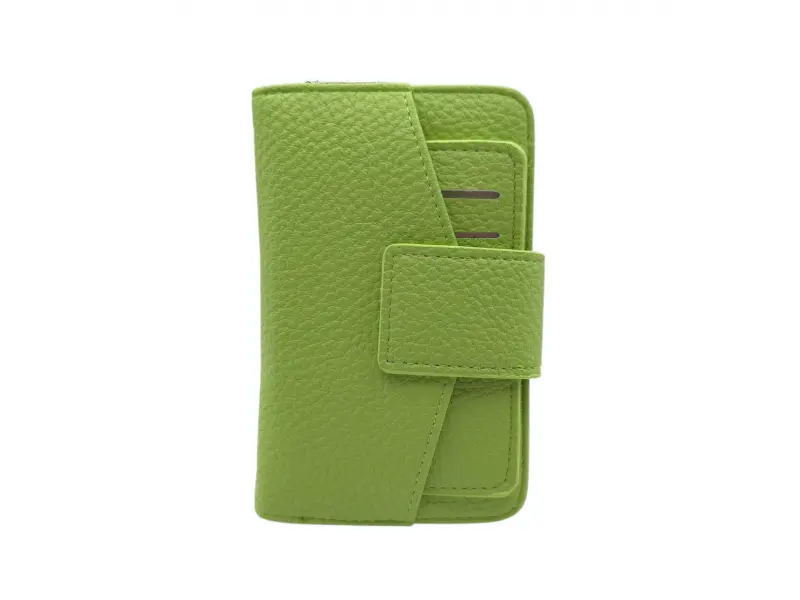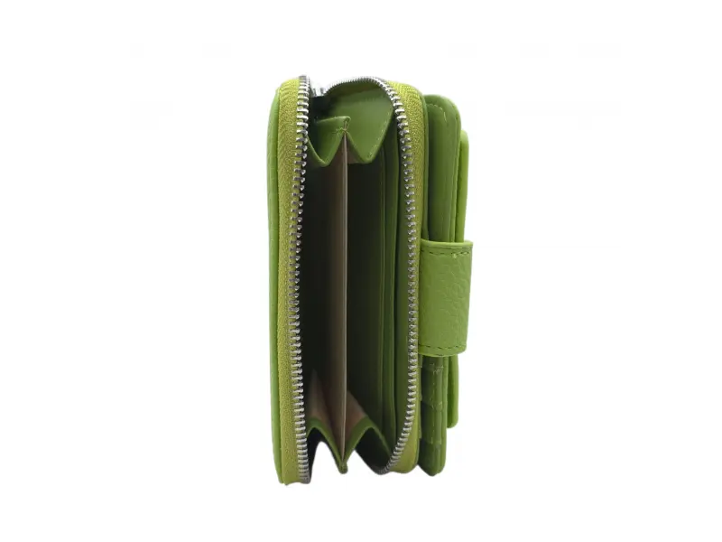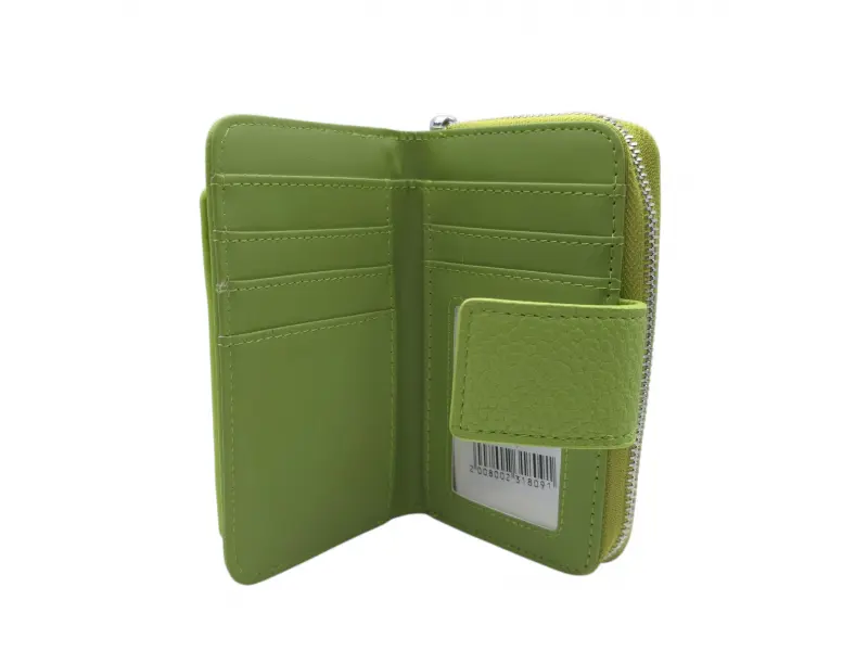 Portofel verde de damă cu un design interesant, confecționat din piele artificială de calitate. Portofel practic pentru femei, cu compartimente convenabile pentru bancnote, carduri și monede. Portofel mic de damă cu închidere tip tic-tac.