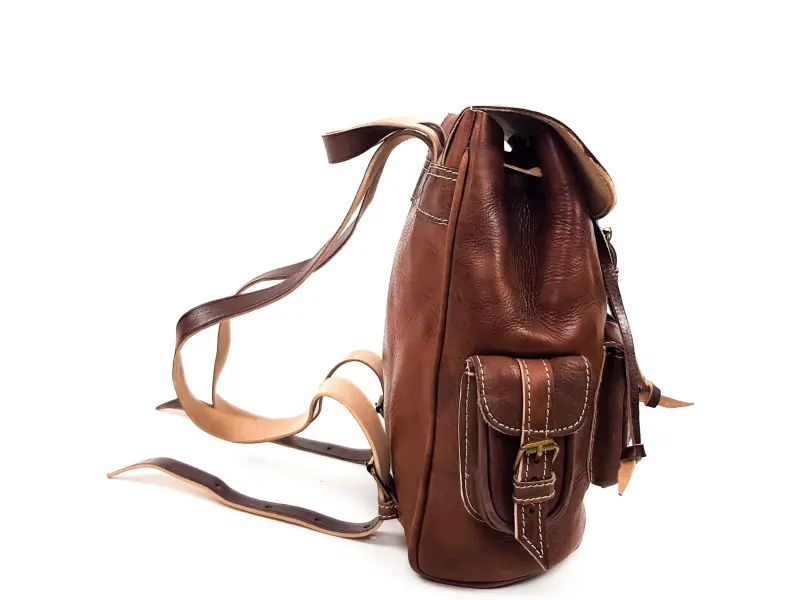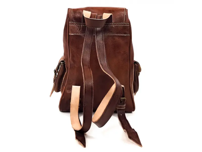 Rucsac de calitate din piele naturală fabricat în Maroc, prelucrare manuală a pielii fără utilizarea de substanțe chimice. Rucsac de damă din piele naturală, tip geantă, fixat cu legături de piele, închidere cu clapă cu curea și cataramă. Piele rezistentă și stabilă, de culoare maro, un buzunar frontal, două buzunare laterale, mânere stabile din piele.