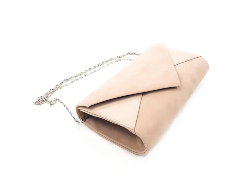 Geantă elegantă de bal din piele întoarsă artificială, de culoare nud. O geantă mică și modernă, potrivită pentru bal, seri formale sau ca geantă de seară. Geantă nud cu un compartiment și lanț argintiu.