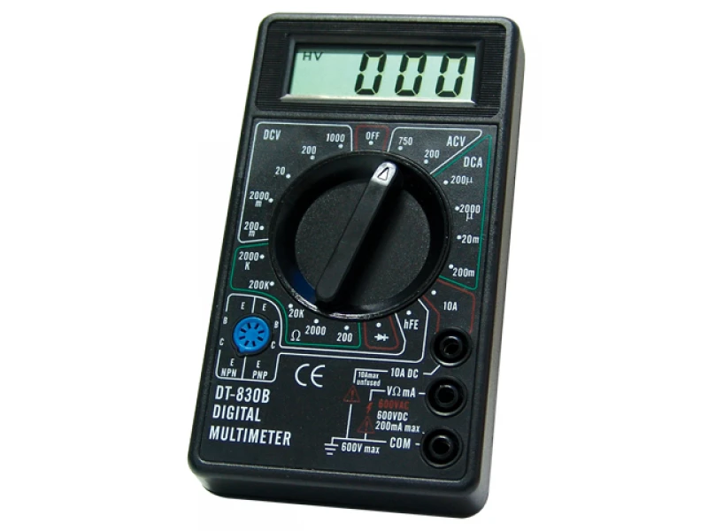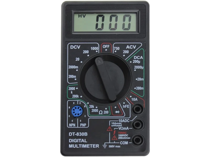 DT-830B este un multimetru digital de 3 1/2 inch pentru măsurarea tensiunii continue și alternative, a curentului continuu, a rezistenței, testarea diodelor și tranzistoarelor. Are protecție la suprasarcină și indicator de baterie descărcată. Instrumentul ideal pentru laboratoare, ateliere, hobby-uri și uz casnic.
