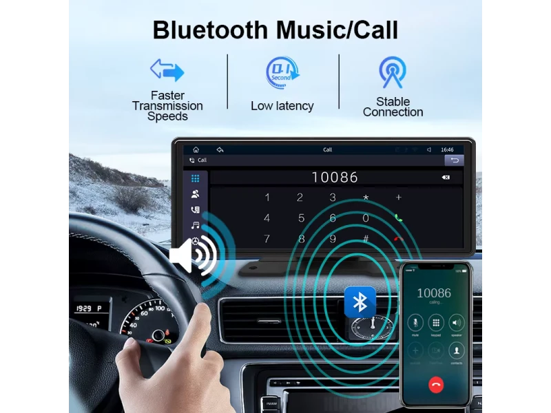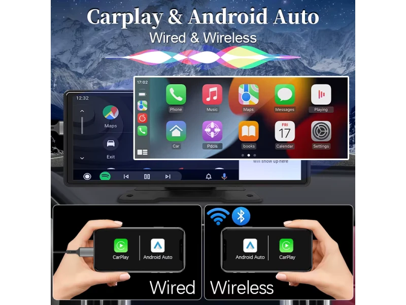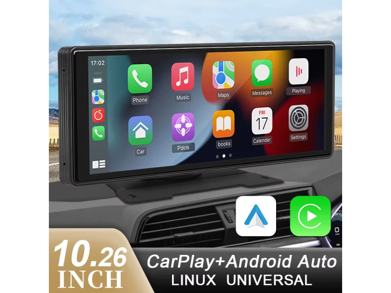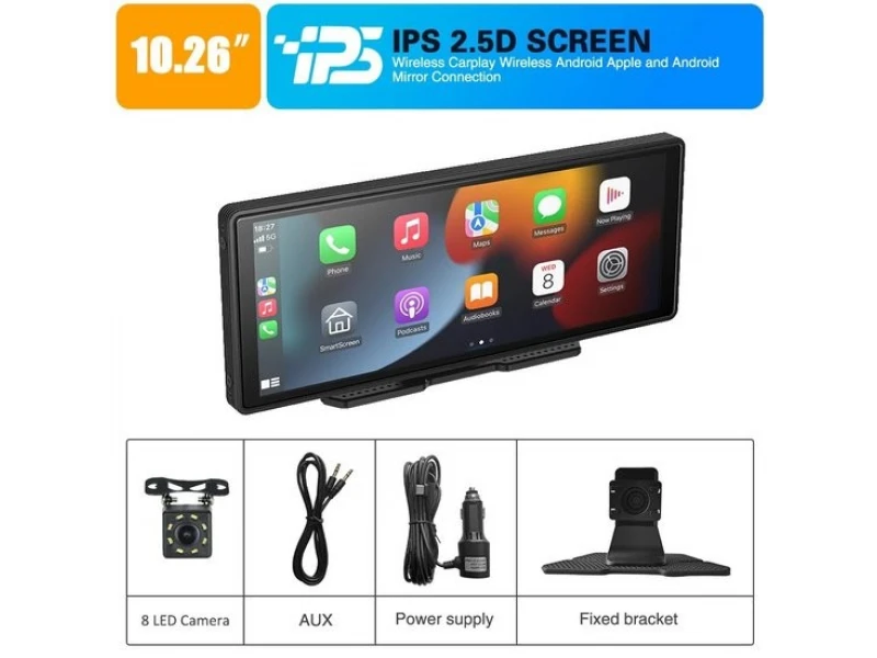 Sistem multimedia CarPlay H105V de 10,26″ cu ecran IPS, Apple CarPlay și Android Auto wireless, player MP5, Bluetooth, AUX, alimentare 5 V/3 A și instalare ușoară fără demontarea bordului.