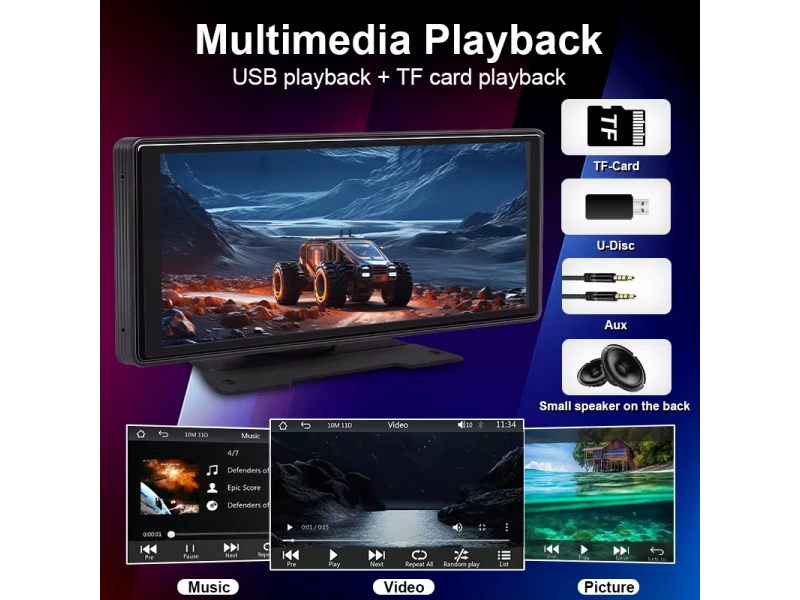 🌟 Principalele avantaje ale sistemului multimedia CarPlay H105V de 10,26″ 📺 Ecran IPS mare și clar Ecran IPS de 10,26″ cu rezoluție înaltă (V851 VGA) pentru vizibilitate excelentă și culori strălucitoare 😊 Diagonală largă pentru o manevrare ușoară și utilizare sigură în timpul conducerii 📱 CarPlay wireless și Android Auto Apple CarPlay și Android Auto wireless integrate pentru oglindirea smartphone-ului iOS sau Android Control vocal și navigare direct prin ecran Player MP5 multifuncțional și Bluetooth Player MP5 încorporat pentru videoclipuri MP5, muzică și navigare GPS prin smartphone Bluetooth pentru apeluri telefonice wireless și streaming de muzică Intrare AUX (3,5 mm) pentru conectarea la sistemul audio din fabrică 🔌 Alimentare și instalare ușoară Alimentator brichetă (5 V/3 A) cu cablu de 3 m inclus Suport de birou pentru instalare fără demontarea panoului Cameră video VGA pentru marșarier opțională (se vinde separat) 📋 Caracteristici tehnice Model: H105V Tip dispozitiv: Player multimedia MP5 pentru mașină Ecran: ecran IPS de 10,26″ Rezoluție: V851 VGA (înaltă definiție) CarPlay: Apple CarPlay fără fir Android Auto: Android Auto fără fir Bluetooth: Da - apeluri telefonice și muzică Alimentare: 5 V / 3 A (cablu brichetă 3 m) Instalare: Suport de birou, nu este nevoie să dezasamblați placa Intrare AUX: 3,5 mm Cameră de mers înapoi: Cameră VGA opțională Sistem de operare: Fără sistem de operare încorporat - oglindire pe smartphone Compatibilitate: Dispozitive iOS și Android cu suport CarPlay/Android Auto 📦 Setul include Multimedia CarPlay H105V Cablu de alimentare brichetă de 3 m (5 V / 3 A) Suport de montare pe birou Cablu AUX (3,5 mm) Manual de utilizare