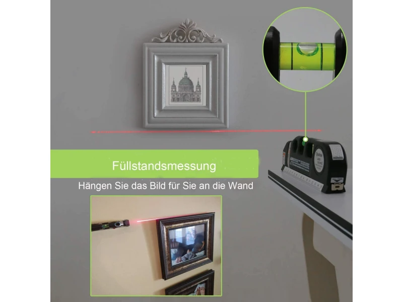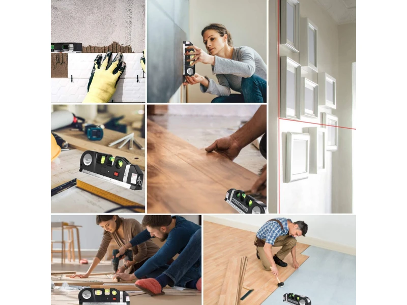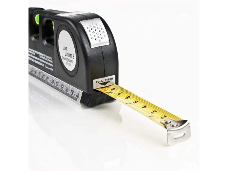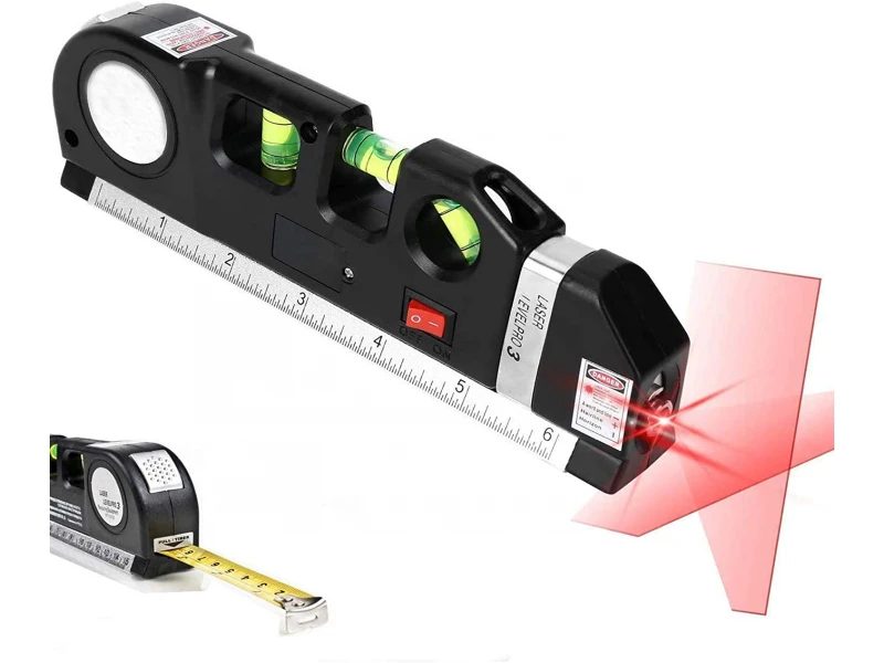 Bula de aer multifuncțională este un accesoriu foarte util în trusa de scule, oferind mai multe recipiente într-unul: nivelă cu bulă de aer pe toate axele, – Fascicul laser pentru urmărirea distanței, – Grilă de măsurare din aluminiu, – Ruletă. Nivela cu bulă de aer oferă unghiuri verticale, orizontale și de 45 de grade. Nivela laser include trei opțiuni: orizontală, verticală și plus. Șina de aluminiu este marcată pe o parte (6 inci) și pe cealaltă parte în centimetri (15 cm) Ruletă autoghidată cu o lungime de 2,5 m.