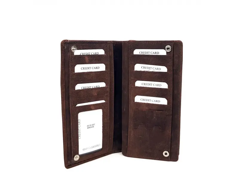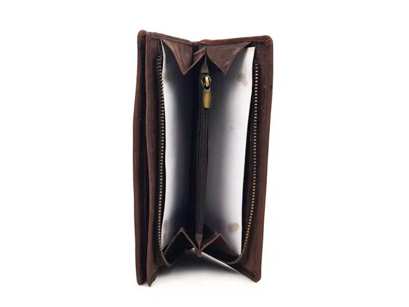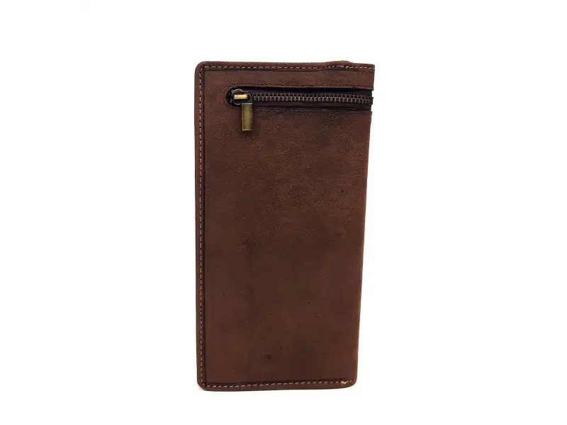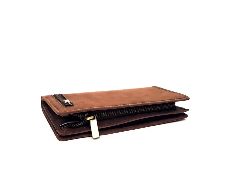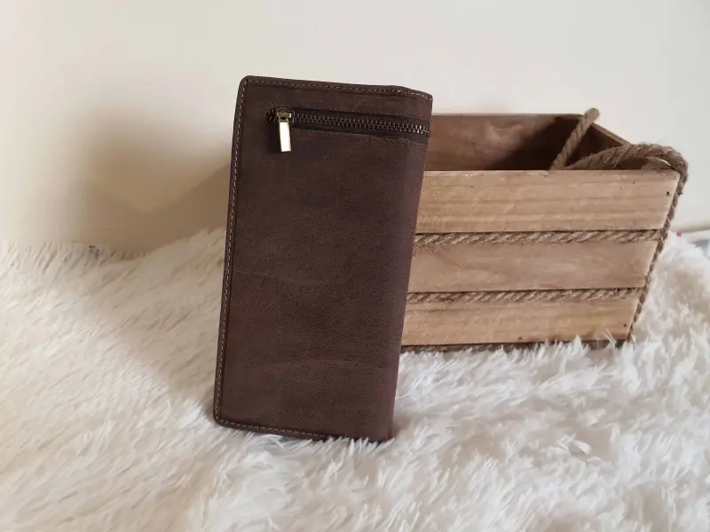 Portofel din piele naturală de înaltă calitate cu fermoar, model unisex, confecționat din piele nubuc robustă, model lucrat manual. Depozitare convenabilă pentru bancnote, monede, carduri și documente.