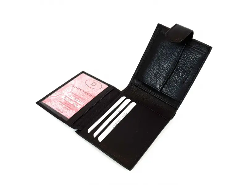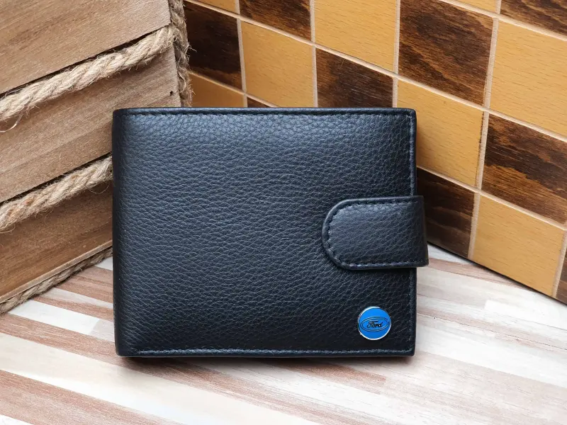 Portofel bărbătesc din piele naturală, cu cataramă și sigla Ford. Portofel bărbătesc interesant, cu multe sloturi pentru carduri și documente, un compartiment pentru bancnote și un compartiment pentru monede.
