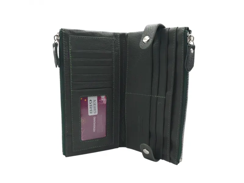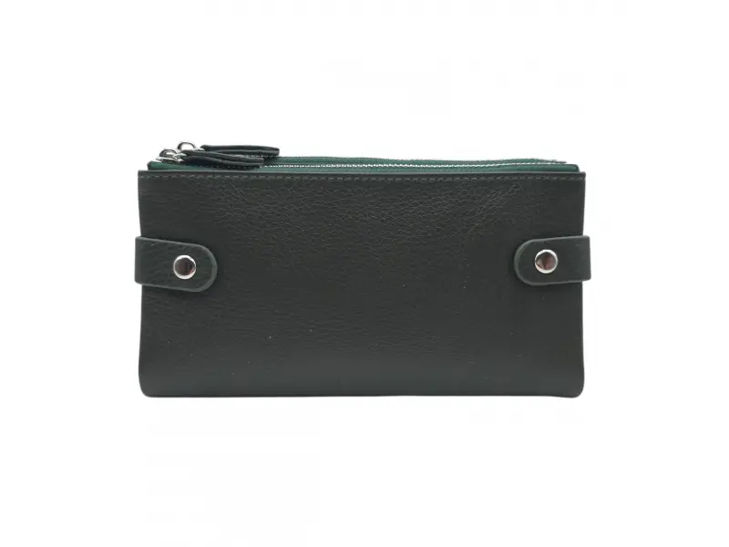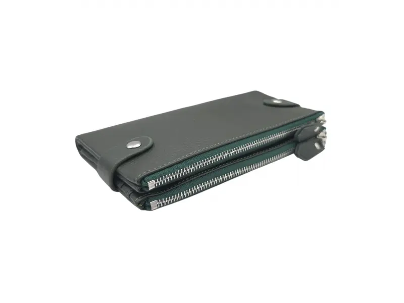 Poșetă de damă verde măsliniu cu două fermoare - Poșetă de damă confecționată din piele naturală. - Închidere cu nasturi tic-tac. - Compartimente pentru carduri. - Compartimente pentru bancnote. - Două buzunare cu fermoar.