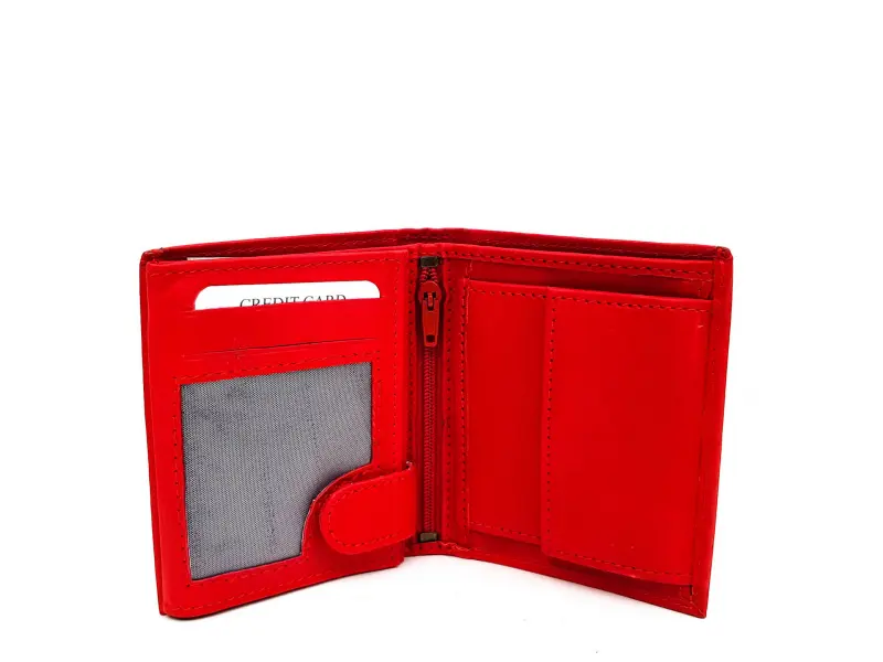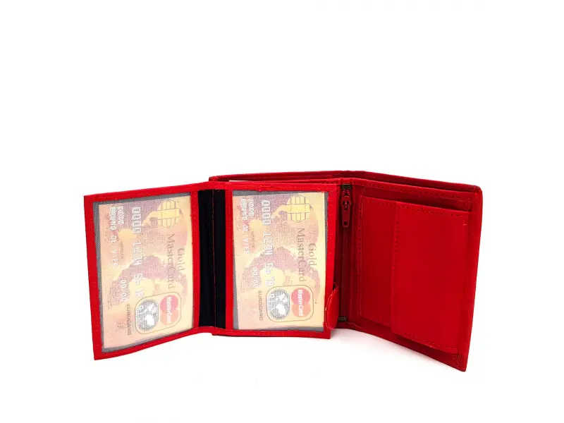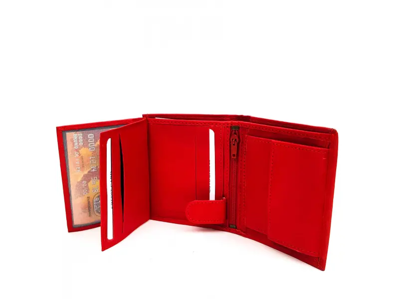 Portofel de damă din piele moale, cu sloturi amplasate convenabil pentru cărți de vizită, carduri bancare și documente. Piele rezistentă, frumoasă culoare roșu intens. Model excelent de portofel, confecționat din piele de calitate.