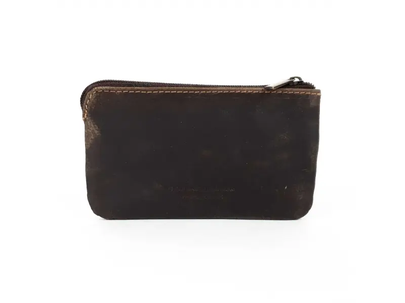 Portofel de înaltă calitate - din piele naturală de vițel - finisaj Hunter. Portofel compact cu compartiment principal cu fermoar, spațiu pentru bancnote, monede și două brelocuri, buzunar frontal cu fermoar.