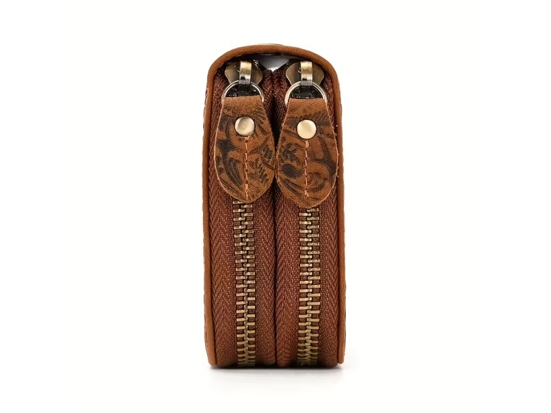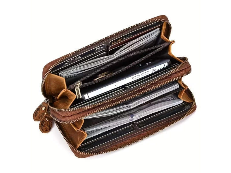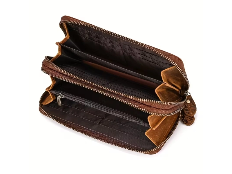 Portofelul se închide cu două fermoare pentru o păstrare mai sigură.