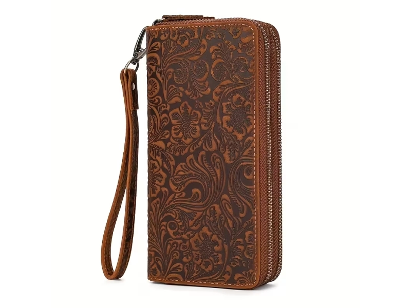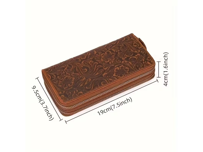 Poșetă de damă ștanțată manual - Poșetă de damă confecționată din piele naturală. - Închidere cu două fermoare. - Compartimente pentru carduri. - Compartimente pentru bancnote. - Portofel cu fermoar. - Mâner pentru transport în mână.