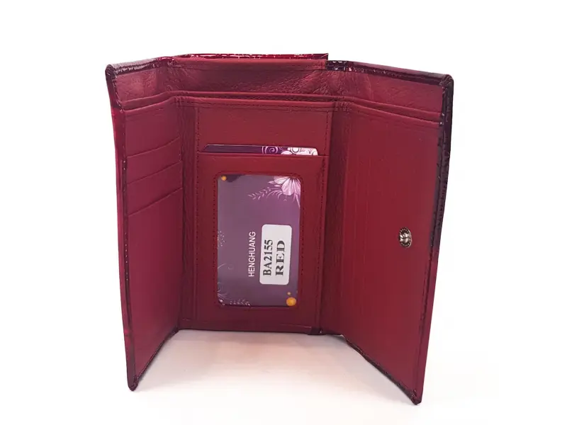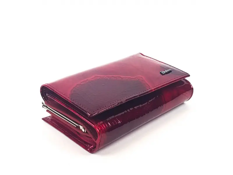 Portofel roșu pentru femei, confecționat din piele naturală și piele lăcuită. Portofel de dimensiuni medii, cu clips exterior și compartiment exterior cu fermoar pentru monede. Model frumos de portofel pentru femei, cu sloturi pentru carduri și cărți de vizită, spațiu pentru bancnote și două separatoare din piele pentru bancnote. Amplasarea foii poate fi diferită.