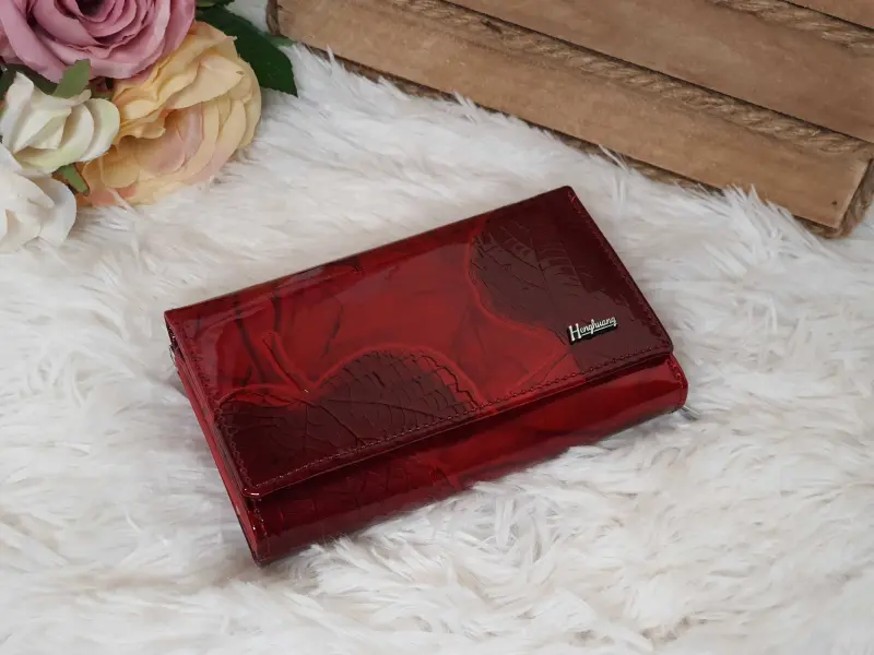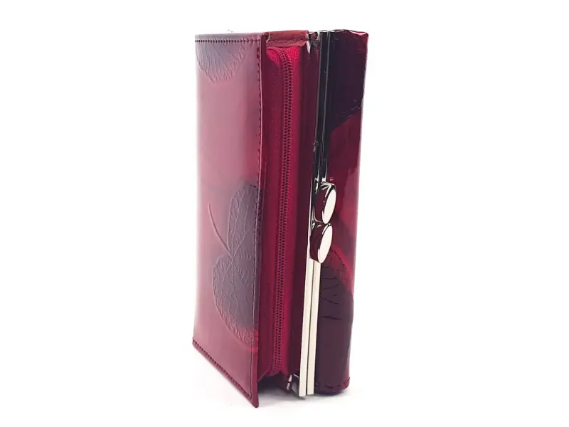 Portofel mediu din piele lăcuită - frunză. Portofel interesant pentru femei, confecționat din piele naturală și piele lăcuită. Portofel mediu cu frunze gravate în culoarea roșie de la magazinul online ePazar.bg