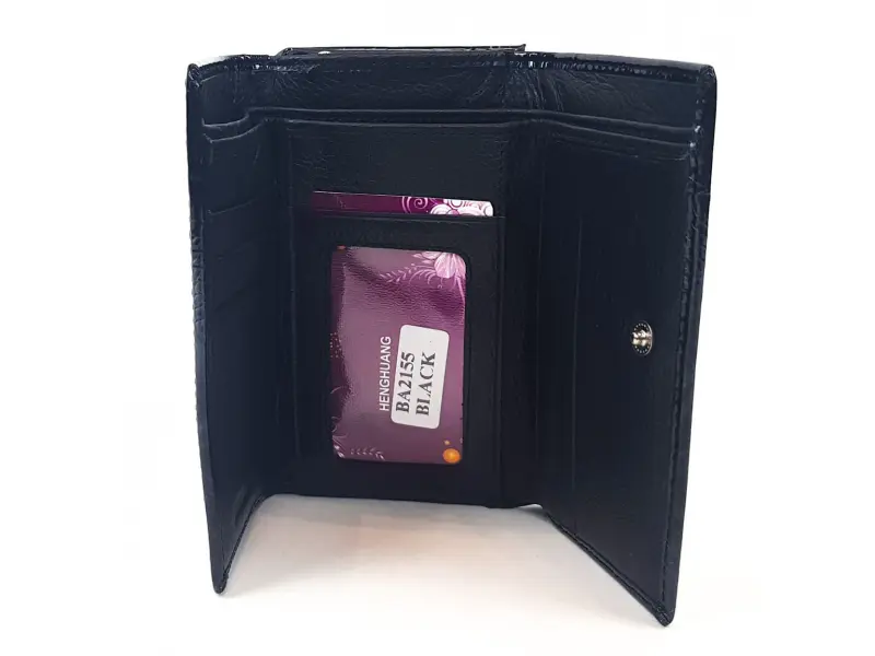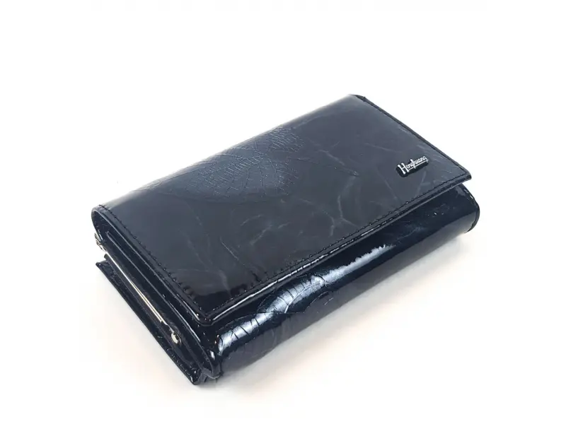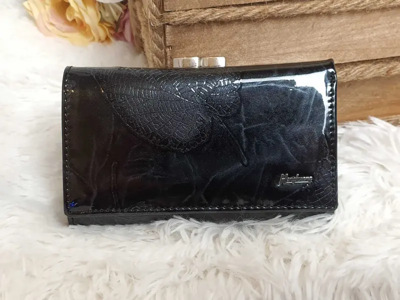 Portofel mediu de damă din piele naturală și piele lăcuită, model deosebit cu compartiment exterior pentru monede - compartiment cu clemă și compartiment cu fermoar, pereți despărțitori interni și sloturi pentru bancnote, carduri și documente. Portofel negru de damă, de mărime medie, cu frunze. Amplasarea frunzelor poate fi diferită.