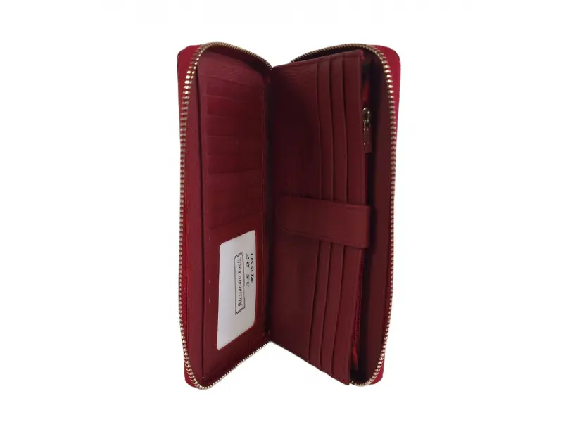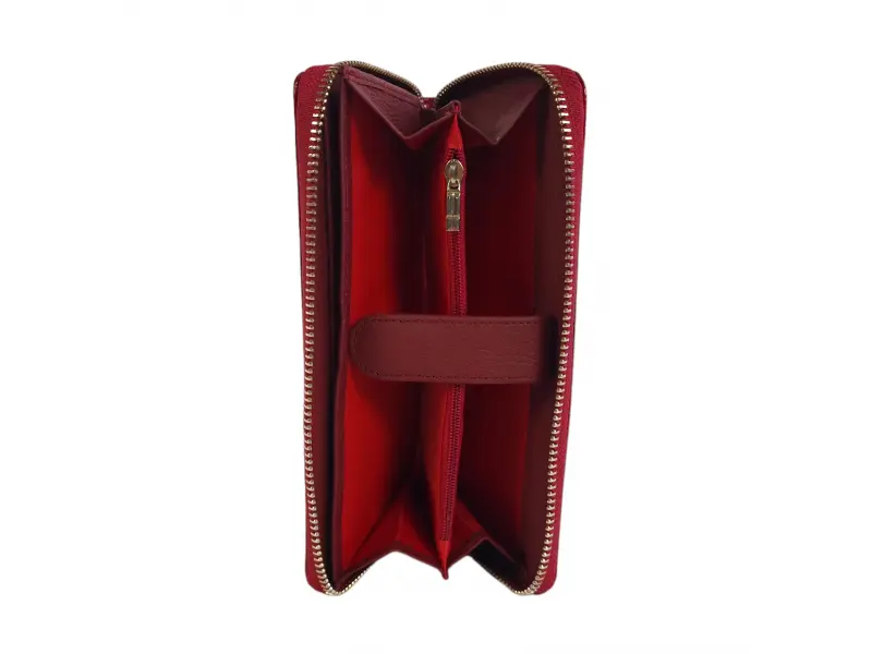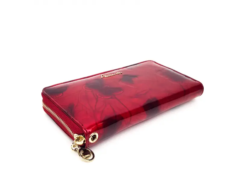 Portofel de damă din piele naturală, din piele lăcuită roșie. Portofel elegant cu închidere cu fermoar, compartiment convenabil din piele naturală pentru bancnote, sloturi pentru carduri și spațiu pentru documente personale. Compartiment cu fermoar pe spate. Amplasarea fluturilor poate fi diferită.