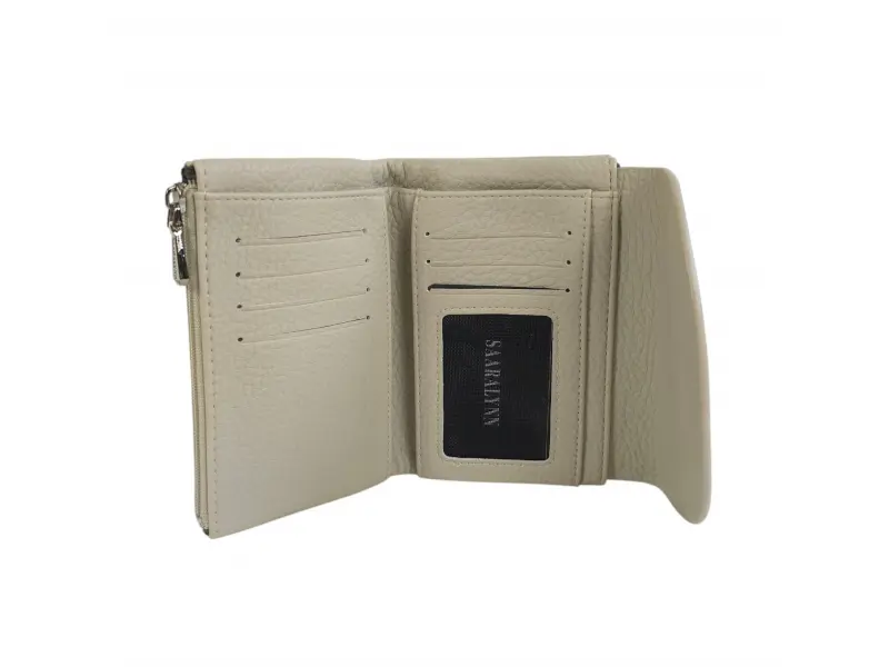 Un portofel de damă la modă, cu un design interesant, confecționat din piele artificială de calitate. Un portofel practic pentru femei, cu compartimente convenabile pentru bancnote, carduri și monede. Portofel bej pentru femei cu închidere magnetică.