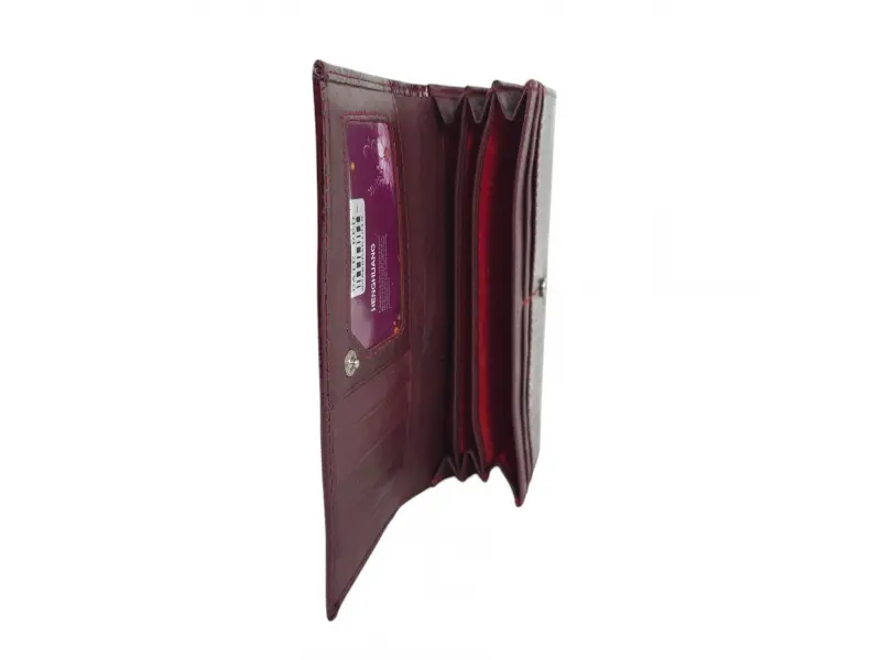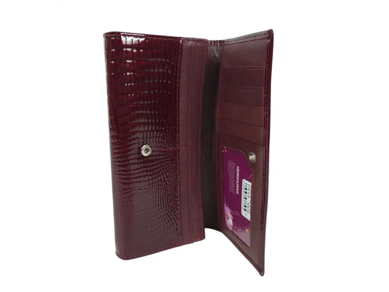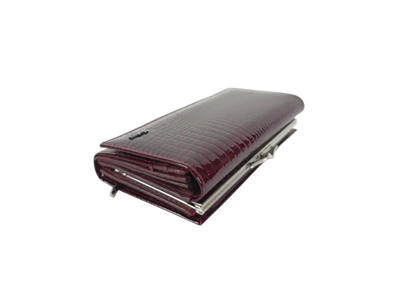 Portofel de damă de culoare vișinie, confecționat din piele naturală și piele lăcuită. Portofel elegant pentru femei, cu compartimente pentru bancnote, sloturi pentru carduri și documente personale și un portofel pentru monede cu fermoar. Portofel frumos pentru femei, cu un design interesant.