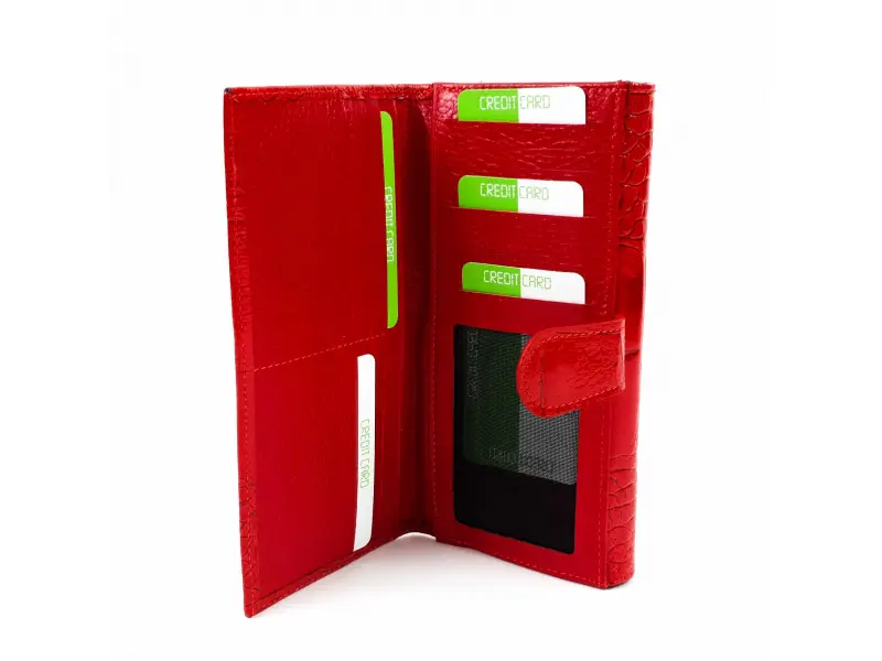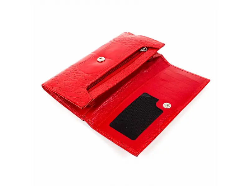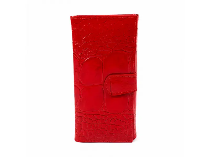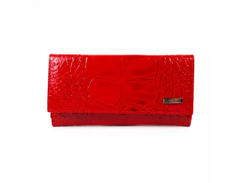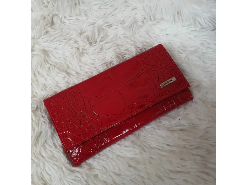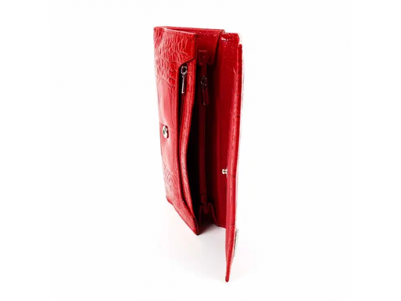 Portofel de damă de înaltă calitate, confecționat din piele de vițel, piele naturală și piele lăcuită. Portofel roșu cu compartiment convenabil pentru bancnote, compartiment pentru monede cu închidere cu fermoar. Numeroase sloturi pentru carduri bancare și de vizită, documente personale în spatele portofelului.