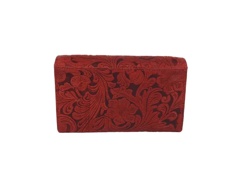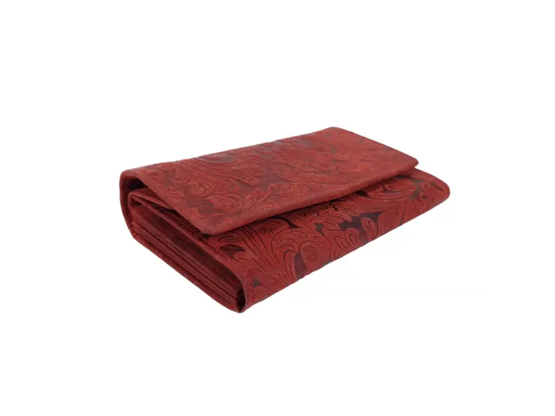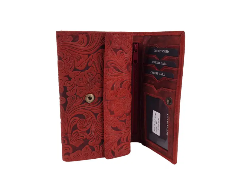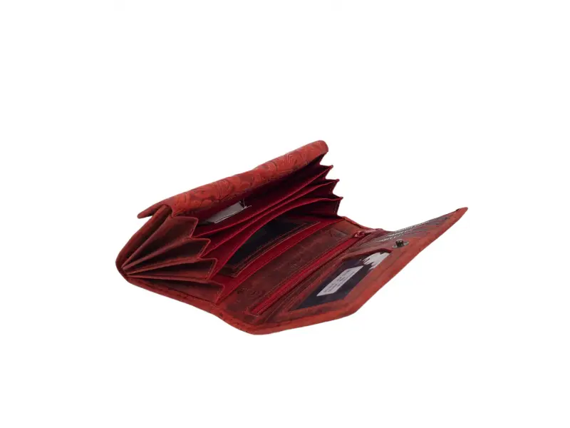 Portofel roșu de damă, confecționat din piele naturală, ștanțată manual. Portofel unic pentru femei, cu multe sloturi pentru carduri și documente, un compartiment pentru bancnote, un compartiment pentru portofel pentru monede și un suport pentru monede.