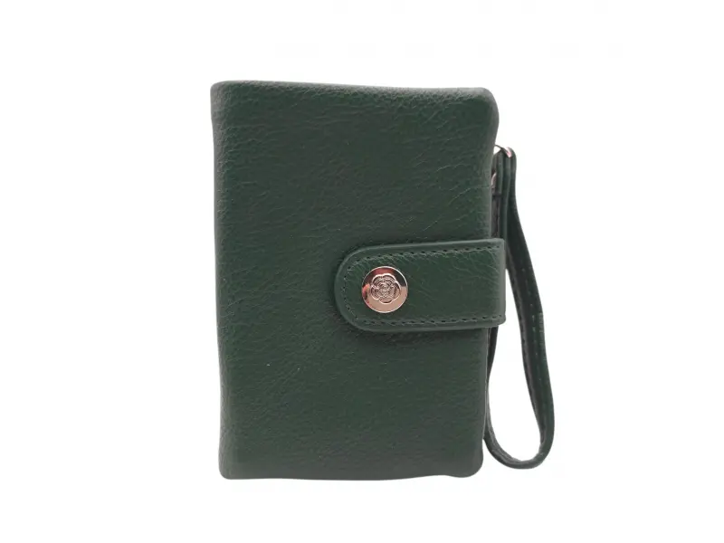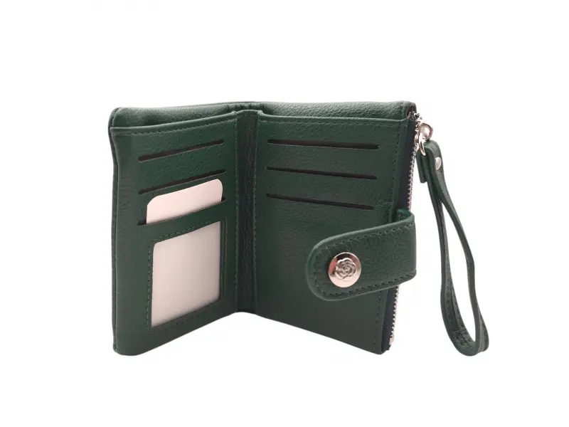 Poșetă de damă în culoarea la modă verde măsliniu - Portofel de damă confecționat din piele ecologică. - Închidere cu un buton de clic. - Compartimente pentru carduri. - Compartiment pentru bancnote. - Buzunar pentru monede cu fermoar.