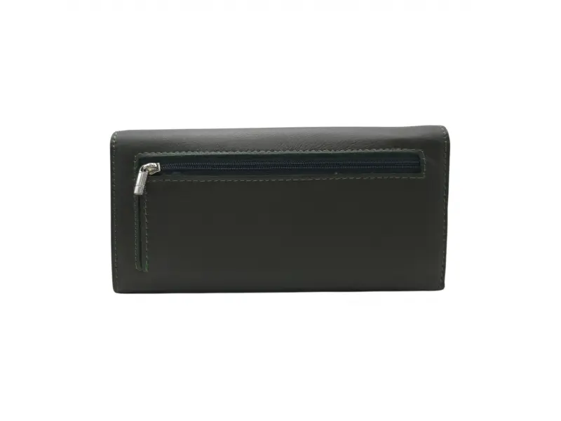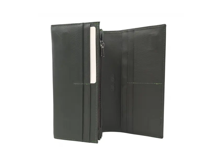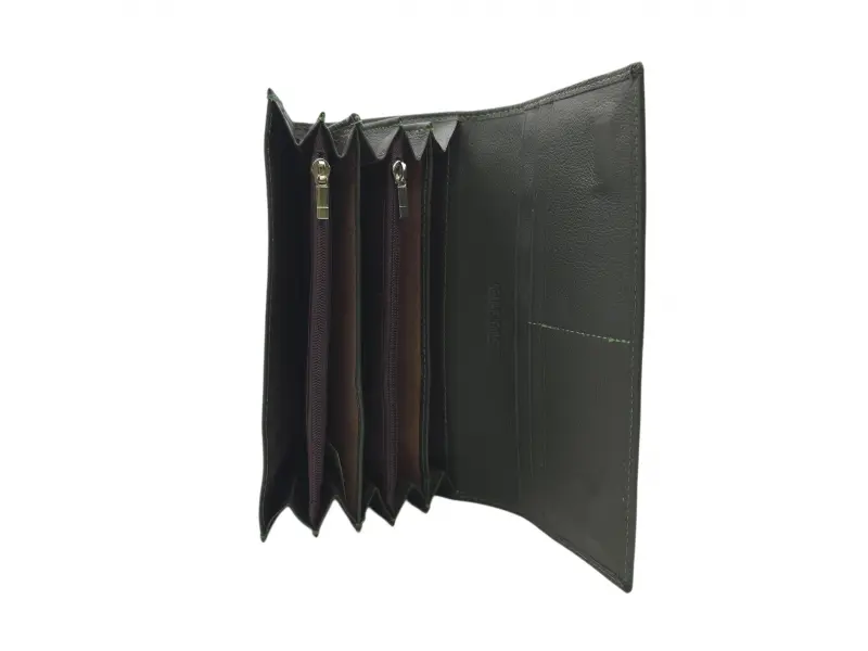 Poșetă de damă verde măsliniu - Poșetă de damă confecționată din piele naturală. - Închidere magnetică. - Compartimente pentru carduri. - Compartimente pentru bancnote. - Două compartimente cu fermoar. - Buzunar spate cu fermoar.