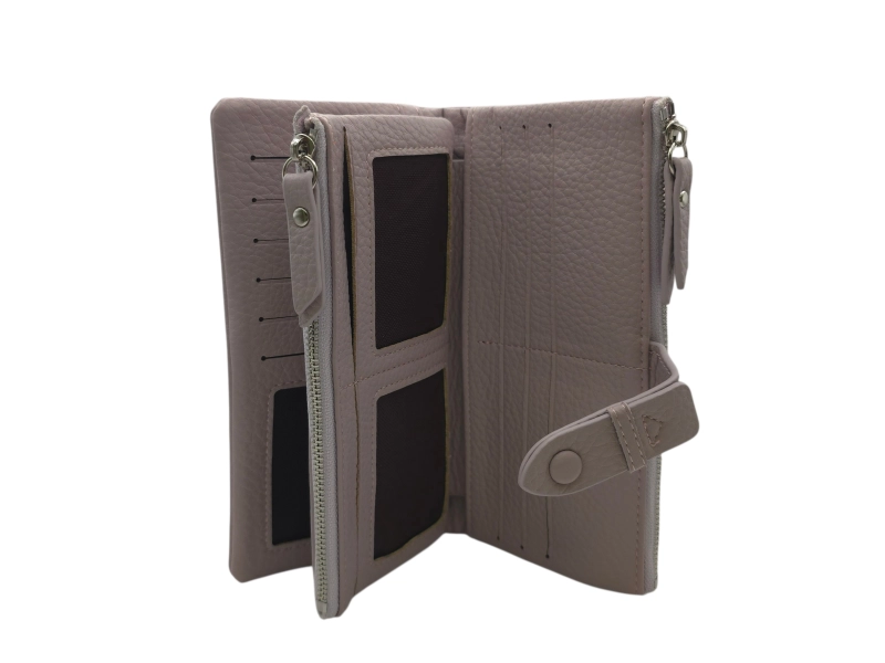 Un portofel de damă la modă, cu un design interesant, confecționat din piele artificială de calitate. Un portofel practic pentru femei, cu compartimente convenabile pentru bancnote, carduri și monede. Un portofel mare pentru femei, cu închidere tip tic-tac.