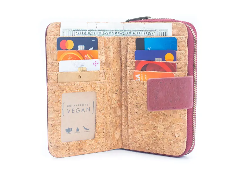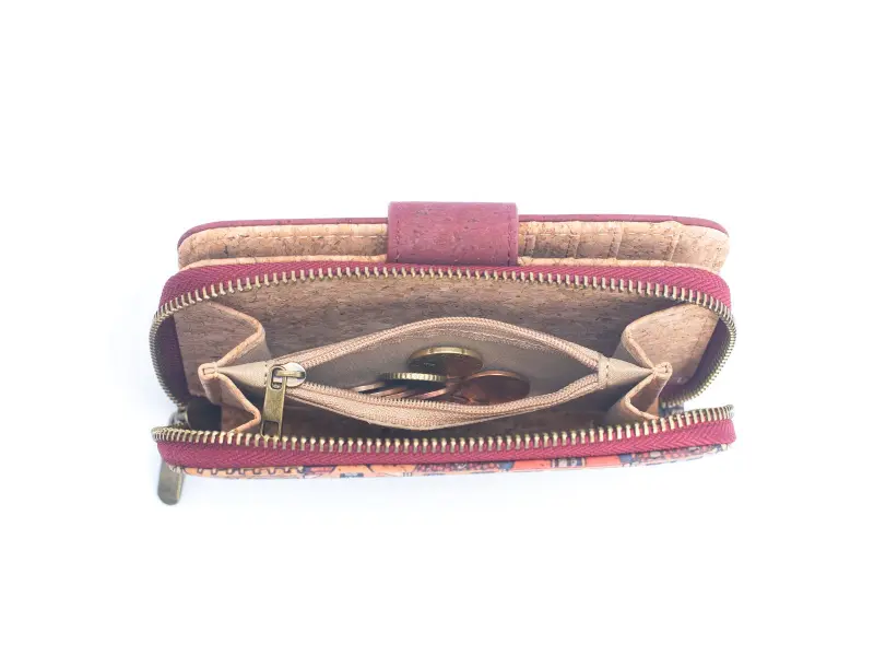 Portofel de damă de înaltă calitate, fabricat din material ecologic - plută. Portofel confortabil pentru femei, cu închidere și buzunar exterior pentru monede cu fermoar, compartiment pentru monede și un buzunar mic pentru monede cu fermoar, numeroase sloturi pentru carduri și documente și un compartiment pentru bancnote.
