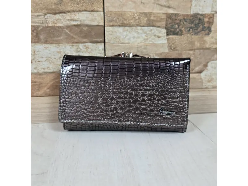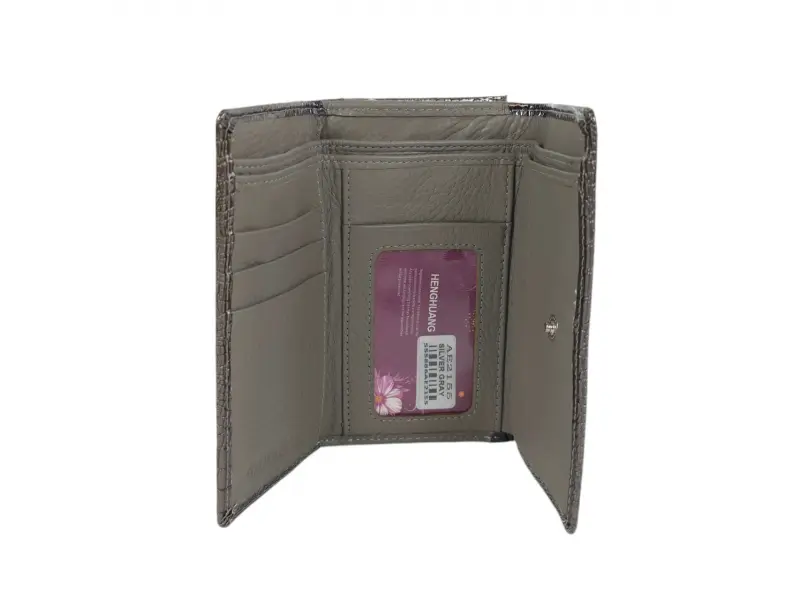 Poșetă medie argintie de damă, din piele naturală și piele lăcuită. Poșetă medie de damă cu compartimente pentru bancnote, sloturi pentru carduri și documente personale și un portofel pentru monede cu fermoar. Poșetă elegantă de damă cu un design interesant.