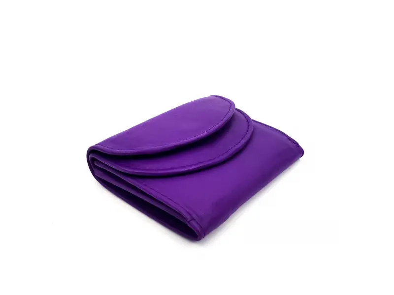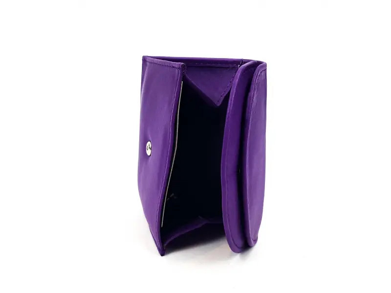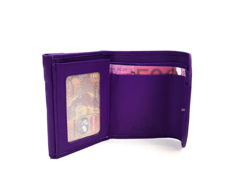 Portofel din piele naturală de înaltă calitate, într-o frumoasă culoare violet intens. Portofel compact cu compartiment separat pentru monede. Spațiu pentru documente, cărți de vizită și cărți bancare, compartimente chiar și pentru cele mai mari bancnote de 500 de euro.