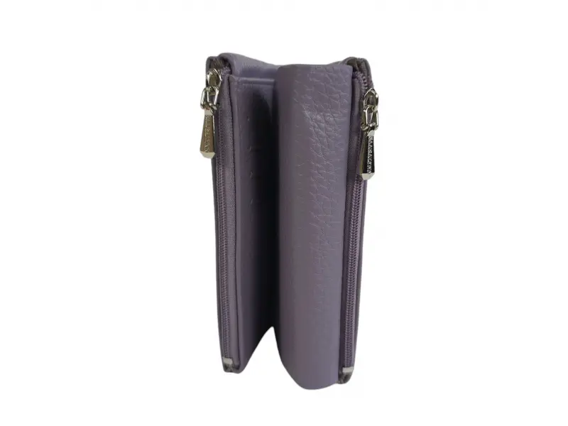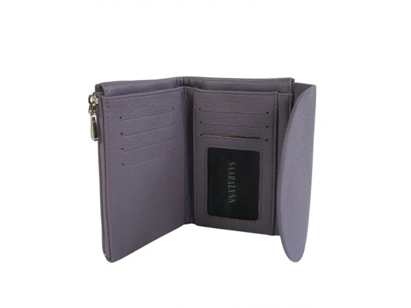 Portofel frumos de damă, cu un design interesant, confecționat din piele artificială de calitate. Portofel practic de damă, cu compartimente convenabile pentru bancnote, carduri și monede. Portofel mov de damă cu închidere magnetică.