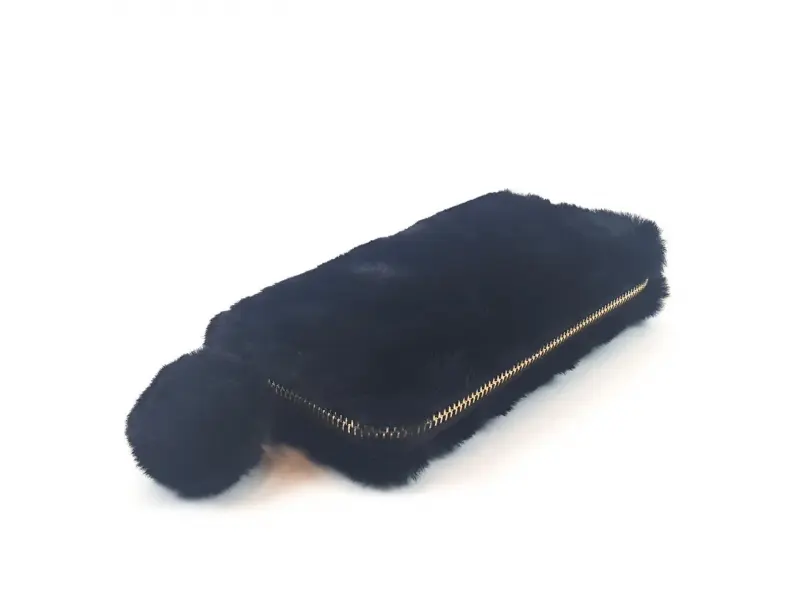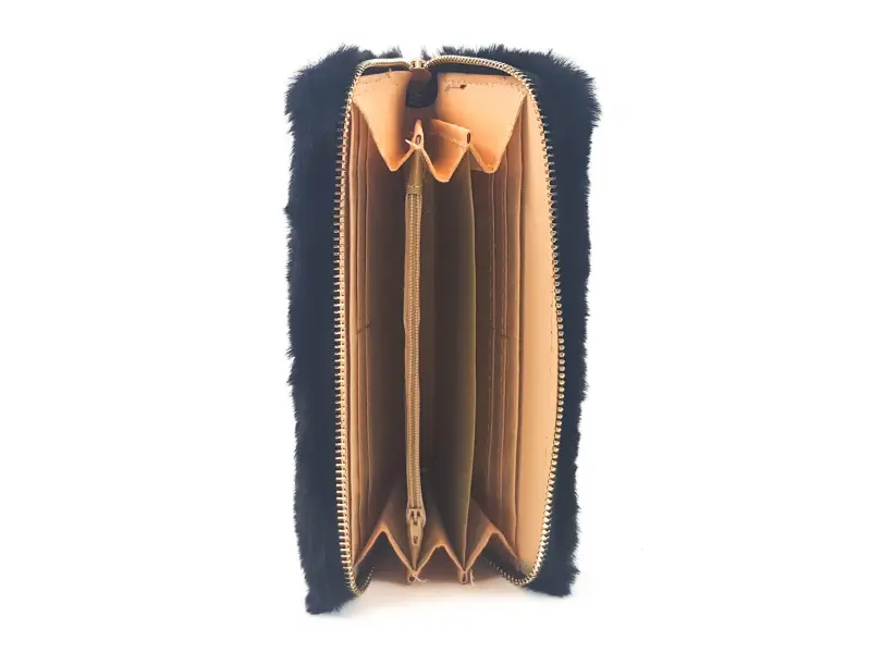 Portofel incredibil de damă din piele ecologică. Portofel negru de pluș pentru femei cu fermoar auriu, compartiment intern pentru bancnote, monede, carduri și documente. Portofel cu o minge pufoasă agățată.