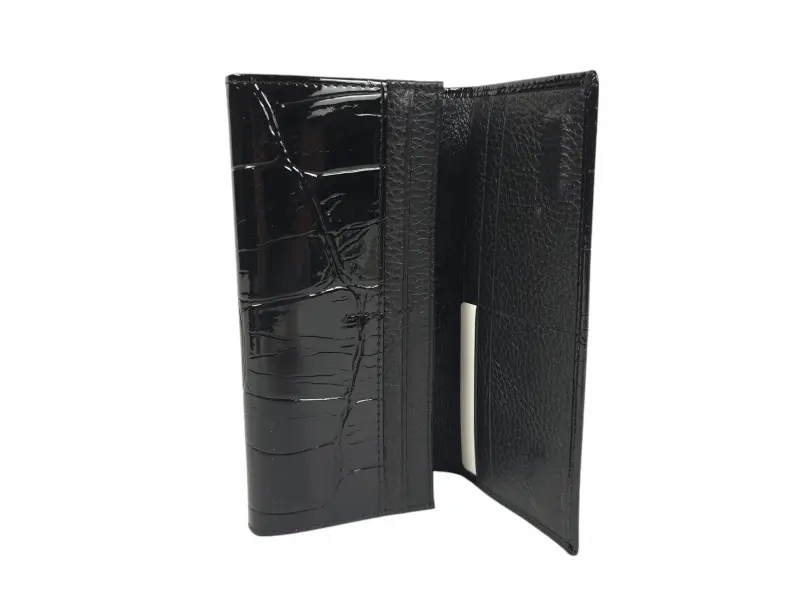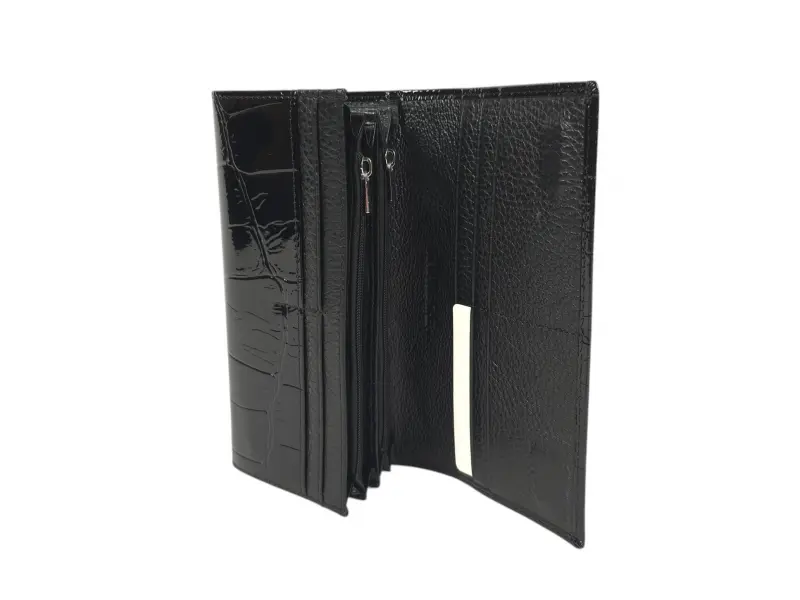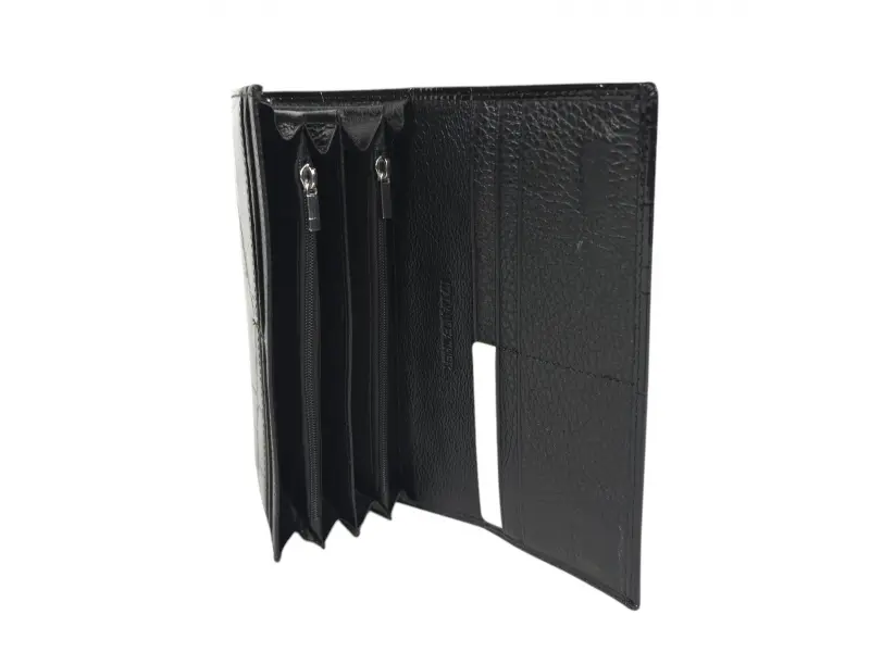 Portofel negru cu închidere magnetică - Poșetă de damă confecționată din piele naturală și piele lăcuită. - Compartimente pentru bancnote. - Compartimente pentru carduri și documente personale. - Compartimente pentru monede cu fermoar. - Buzunar spate cu fermoar.