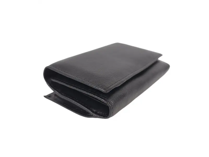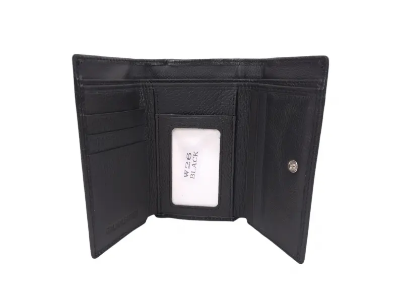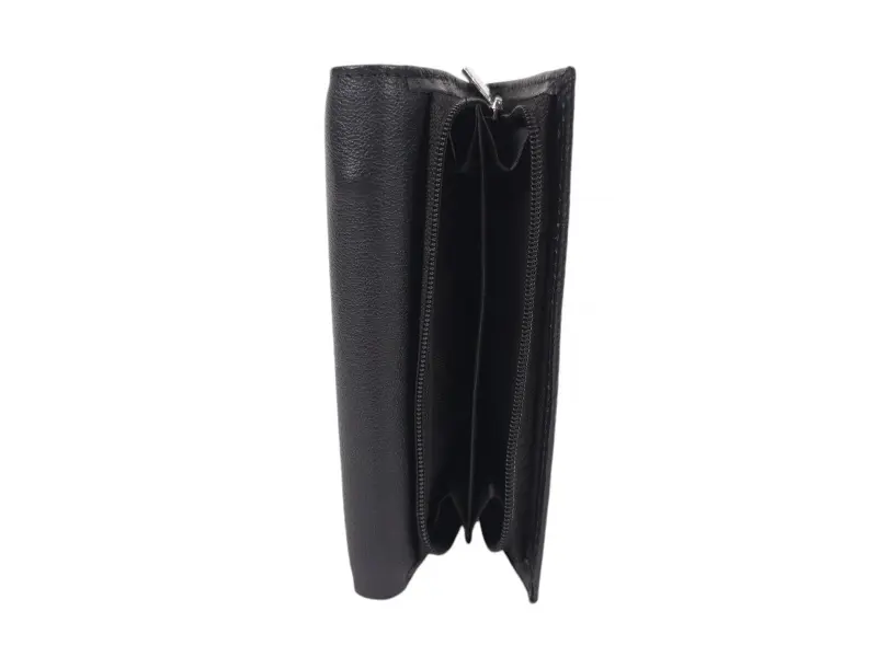 Portofel confortabil de damă, confecționat din piele naturală de înaltă calitate. Portofel negru cu compartimente pentru bancnote, numeroase sloturi pentru carduri și documente personale și un buzunar pentru monede cu fermoar. Portofel modern de damă cu închidere tip tic-tac.