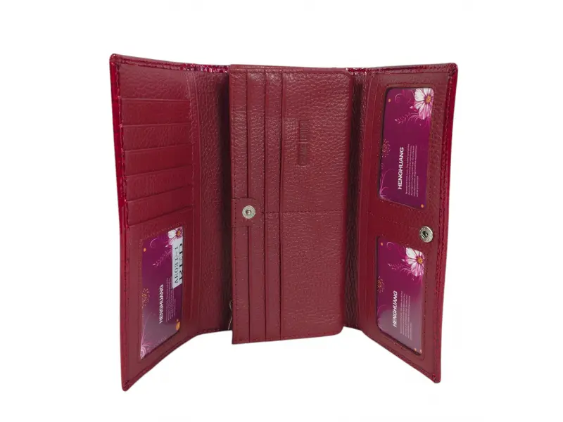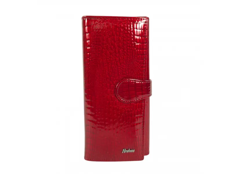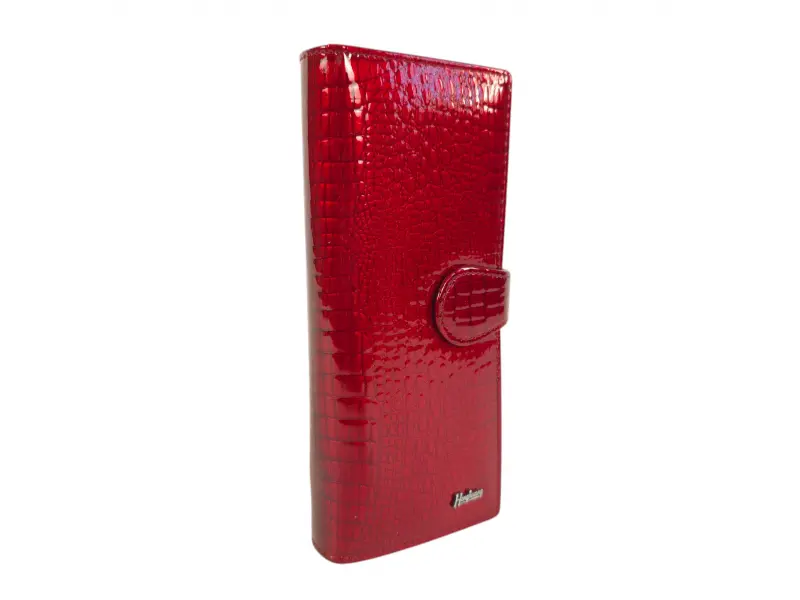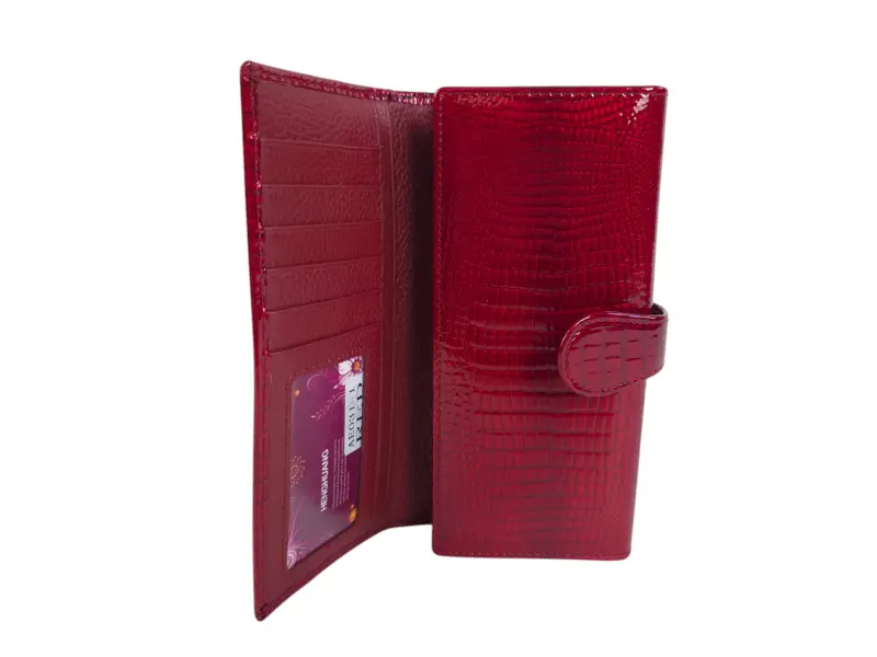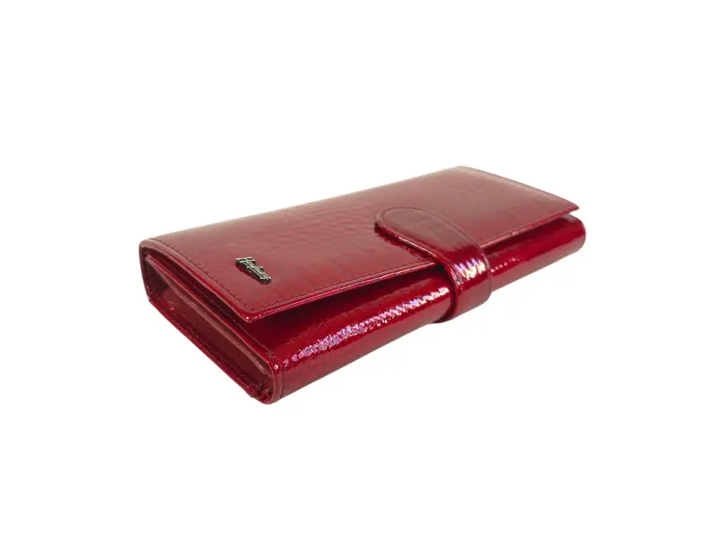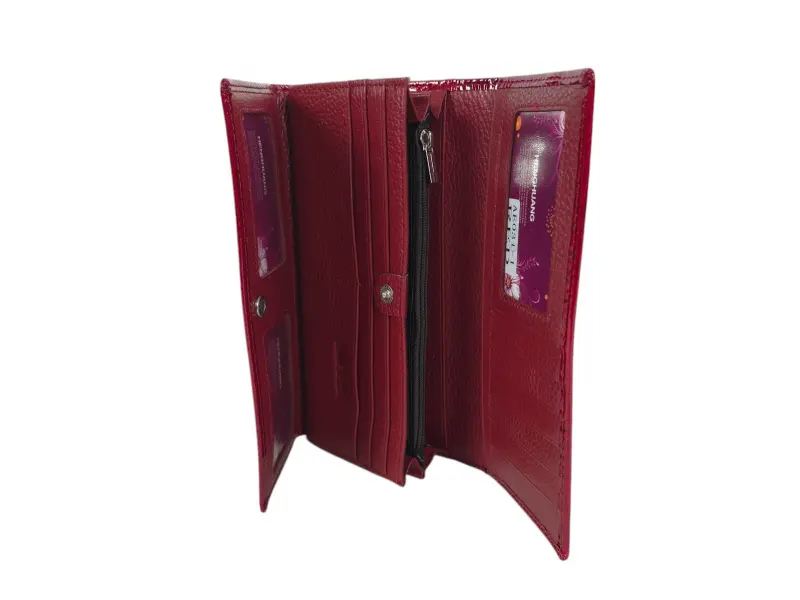 Portofel roșu de damă, confecționat din piele naturală și piele lăcuită. Portofel vertical de damă cu compartimente pentru bancnote, sloturi pentru carduri și documente personale și un portofel pentru monede cu fermoar. Portofel frumos de damă cu un design interesant.