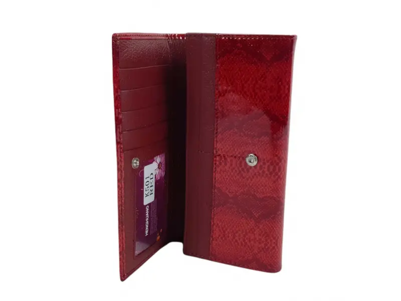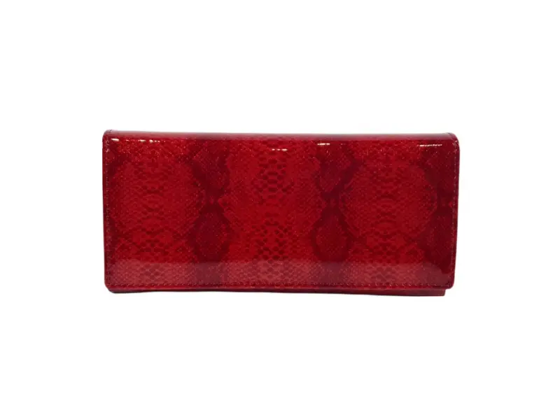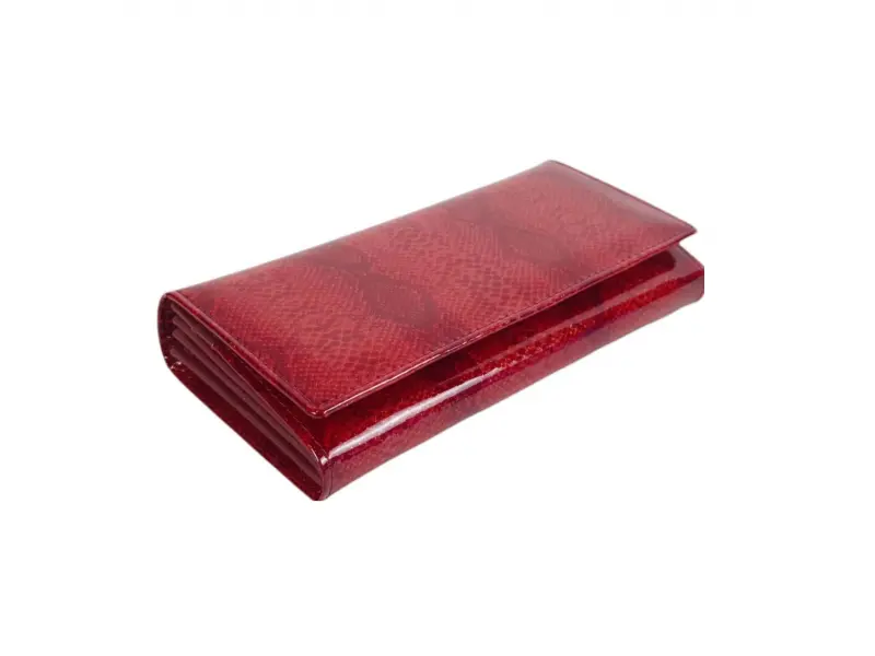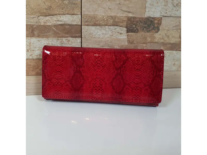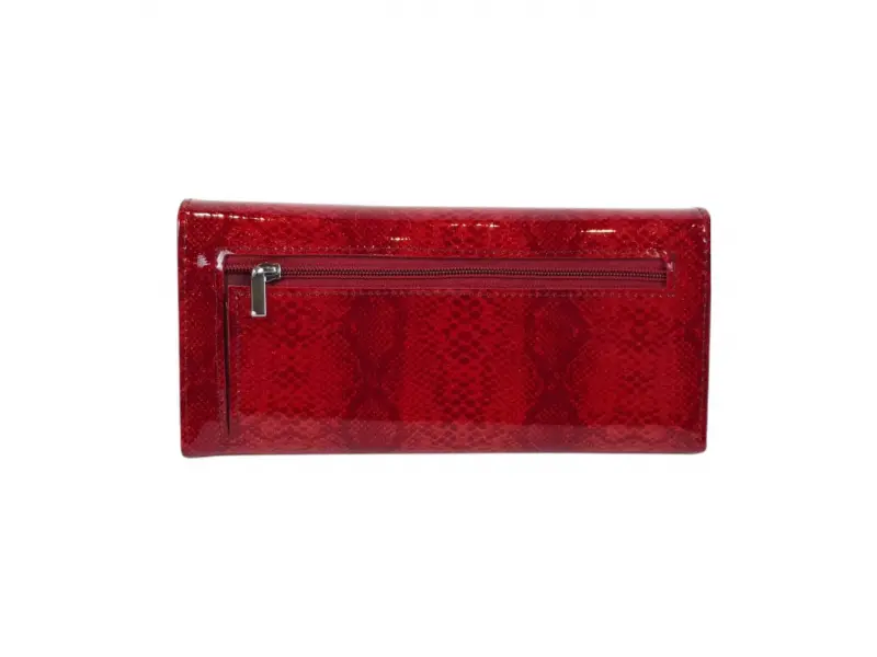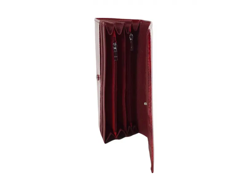Portofel de damă de înaltă calitate, confecționat din piele naturală cu finisaj lăcuit. Portofel roșu cu compartimente practice pentru bancnote, numeroase sloturi pentru carduri și documente personale, un buzunar interior pentru monede cu fermoar și un buzunar spate cu fermoar.
